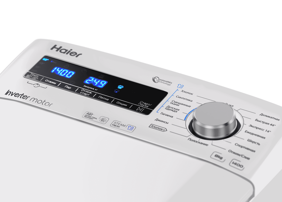 Стиральная машина HAIER RTXS G584TMH-07 с вертикальной загрузкой ощутимо сэкономит место в ванной, но при этом у неё увеличенная загрузка — до 8 кг белья. Для эффективного расхода воды и экономии времени в стиральной машине реализовано автовзвешивание вещей — стирка оптимизируется, исходя из данных о загрузке и выбранной степени загрязнения вещей. Моющее средство работает максимально эффективно благодаря технологии InstantMix. Она позволяет предварительно смешивать порошок с водой и воздухом и подавать к вещам в виде готовой активной пены. В модели целых 13 программ стирки, среди которых присутствуют быстрые циклы, а также режимы для джинсов, детской и спортивной одежды. Есть и технология отстирывания пятен разного происхождения. Во время стирки вещи дополнительно обрабатываются паром — удаляются аллергены, бактерии, легче глажка. Загружать и разгружать стиральную машину удобно и безопасно, потому что створки барабана открываются плавно. Современное управление с ярким информативным дисплеем делает использование машины максимально простым. Бесщёточный инверторный мотор в модели RTXS G584TMHR-07 работает очень тихо, экономичен и имеет гарантию 12 лет. Эта стиральная машина с вертикальной загрузкой представлена в двух цветах: классическом белом и стильном сером.