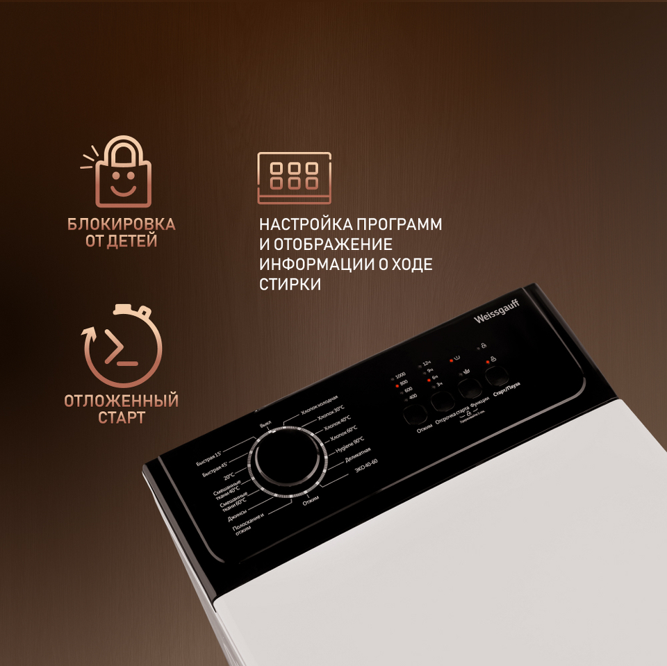 Cтиральная машина Weissgauff с вертикальной загрузкой, имеющая достойные показатели загрузки до 6 кг белья и скорости отжима до 1000 оборотов в минуту - это отличное качество по действительно доступной цене!
