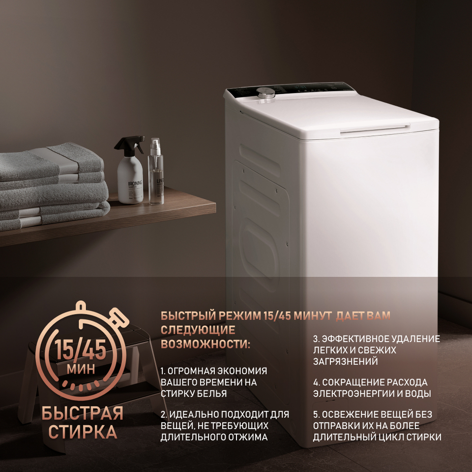 Вертикальная загрузка - открывает целый ряд эргономических преимуществ, связанных с возможностью установки данной модели даже в самой малогабаритной квартире!