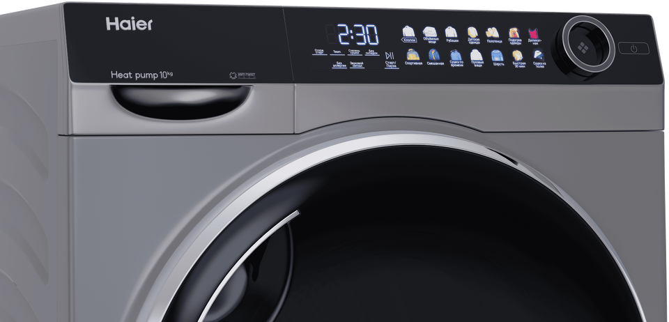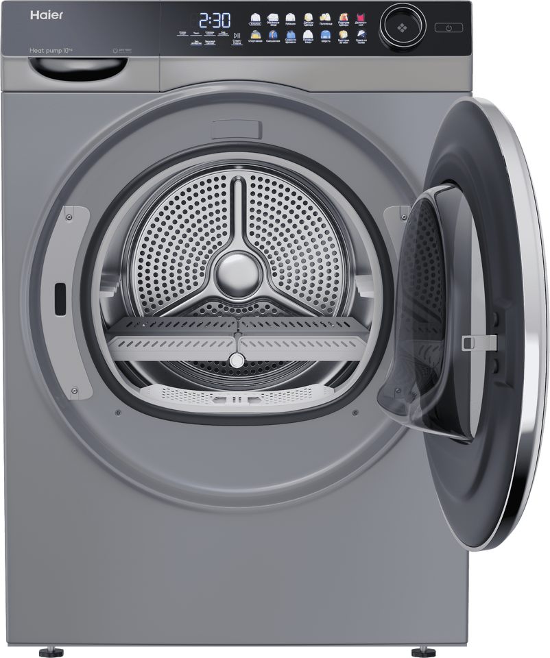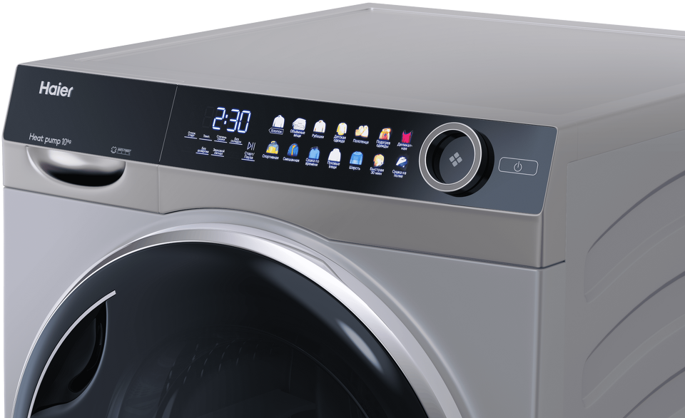 Серебристая модель Haier HD100-A2378S оборудована лучшими технологиями для сушильных машин.