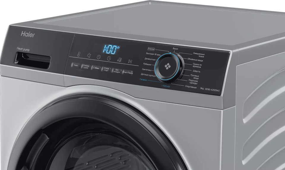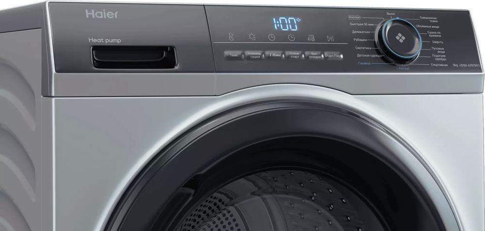 Haier HD90-A2929AS работает тихо. Уровень шума — 65 дБ(А), сопоставимо со звуком спокойного голоса. Запланировать сушку на ночь (или другое время) можно с опцией «Таймер» (от 0 до 12 часов).