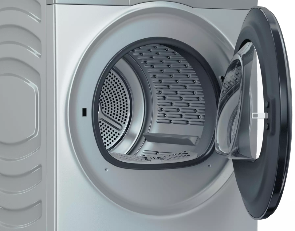 Модель имеет серебристый корпус с черной дверцей и панелью управления в виде акцентов. Для разных типов белья есть 15 интеллектуальных программ, включая программу удаления запахов i-Refresh, «Подогрев одежды» и быструю сушку за 30 минут. Датчики барабана автоматически определяют вес одежды, уровень влажности, необходимую температуру (от 50 до 65 ℃) и время программы, но параметры можно задать самостоятельно. Также можно выбрать один из трех режимов сушки: «Под утюг», «Экстрасухая» и «В шкаф».
