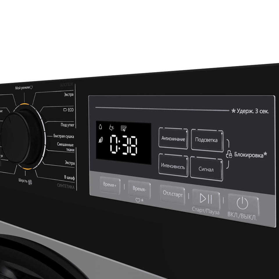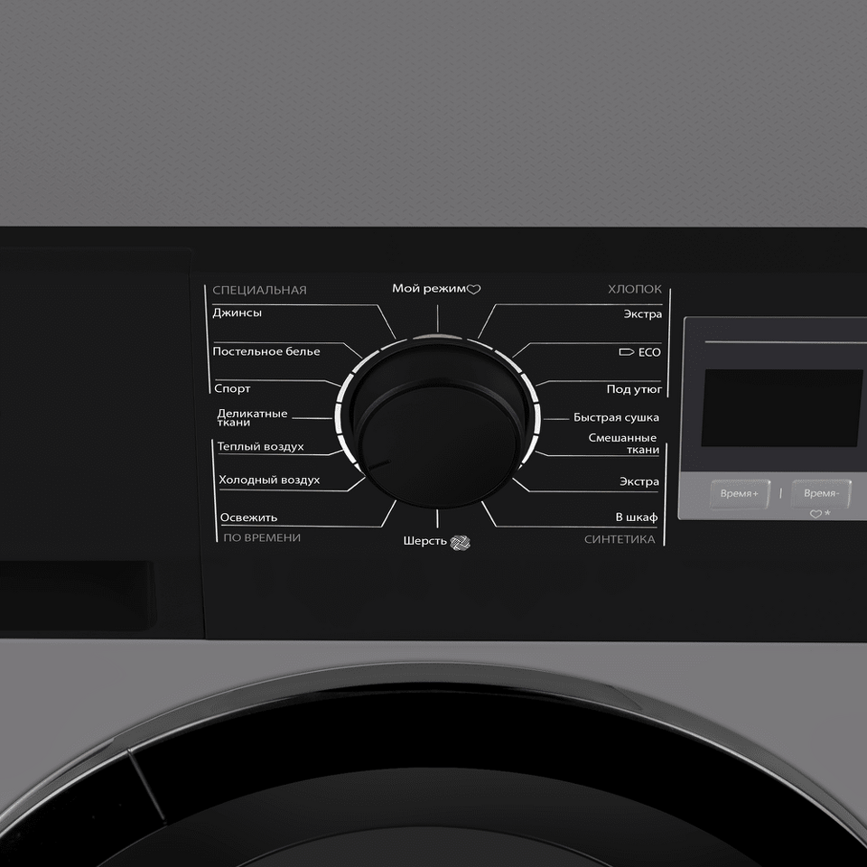 «Мой режим» позволит вам создать свою программу сушки с индивидуальными настройками: температурой, скоростью оборотов при отжиме и дополнительными функциями. Ваша уникальная программа будет сохранена и отобразится в верхнем положении регулятора, вы сможете в любой момент включить ее.