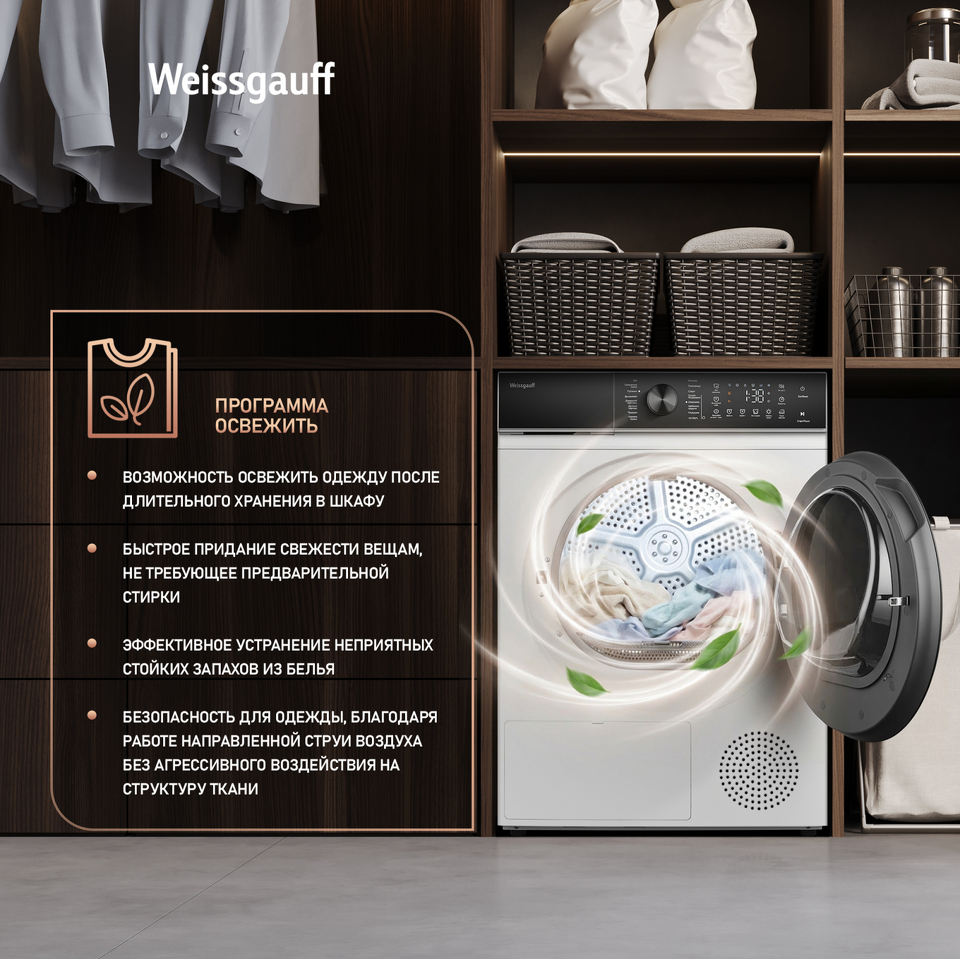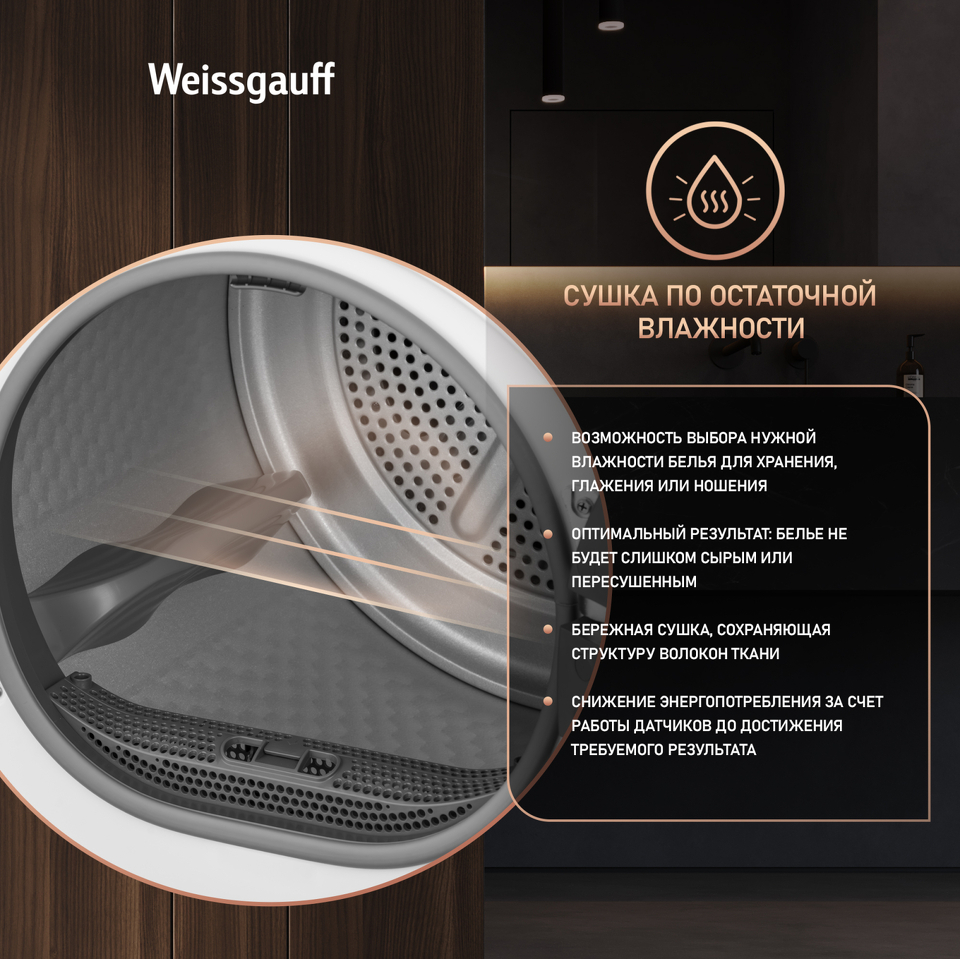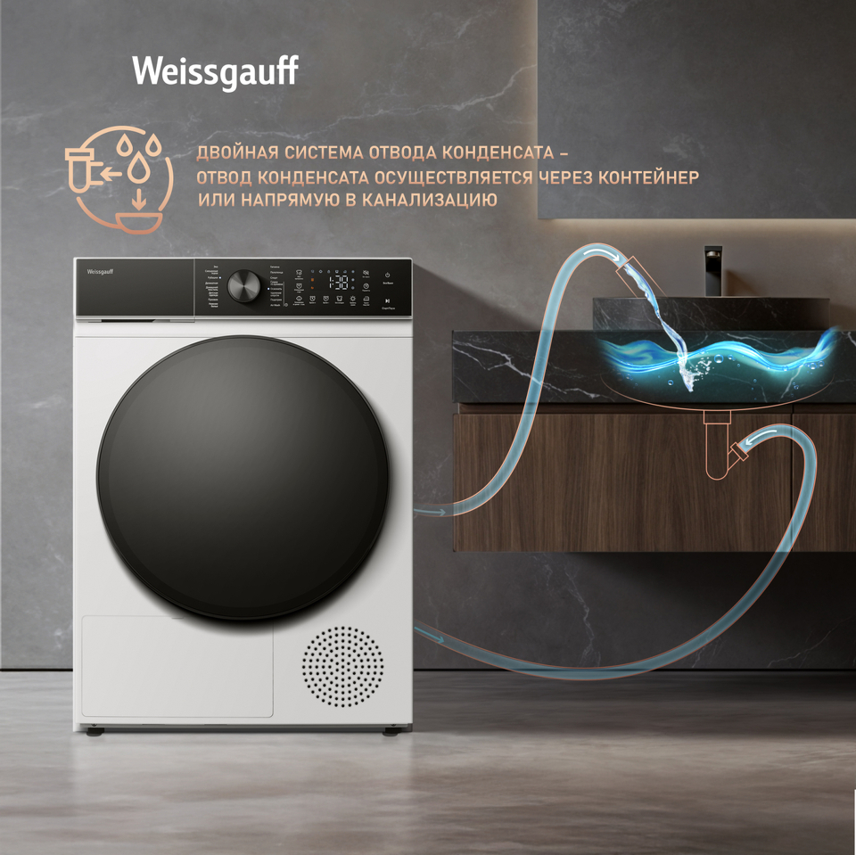 Отдельностоящая сушильная машина Weissgauff, оснащенная тепловой помпой, имеет фантастический показатель загрузки до 10 килограммов белья, что делает данную модель реальным воплощением основного принципа Weissgauff: "Качество, доступное каждому"!