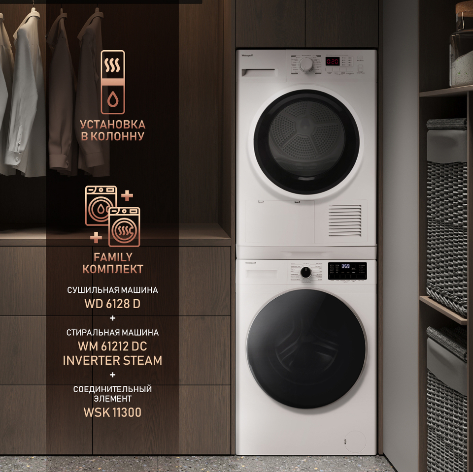 FAMILY- комплект! Данная модель идеальна для установки в колонну со стиральной машиной Weissgauff WM 61212 DC Inverter Steam, образуя цельный и гармоничный комплект бытовой техники, выполненный в едином дизайне! Обратите внимание, что для установки в колонну потребуется дополнительно приобрести Соединительный элемент Weissgauff WSK 11300.