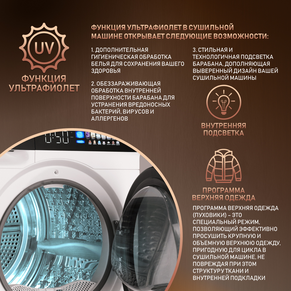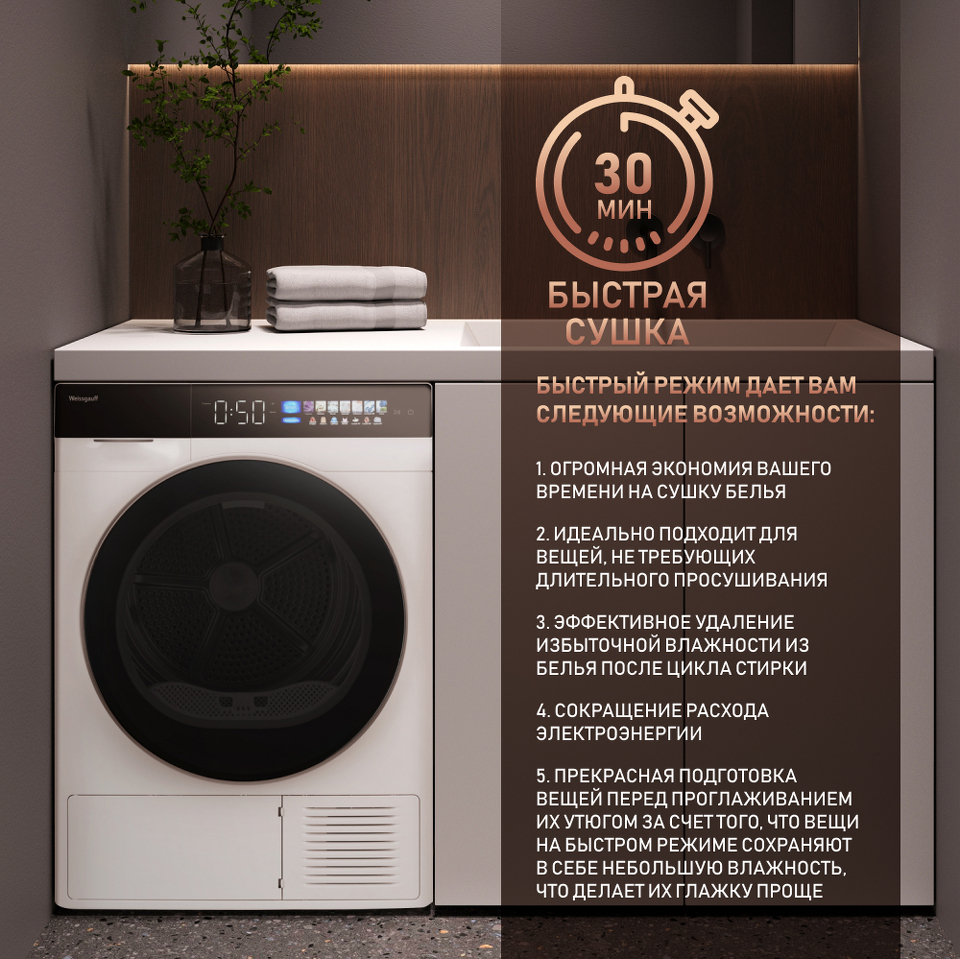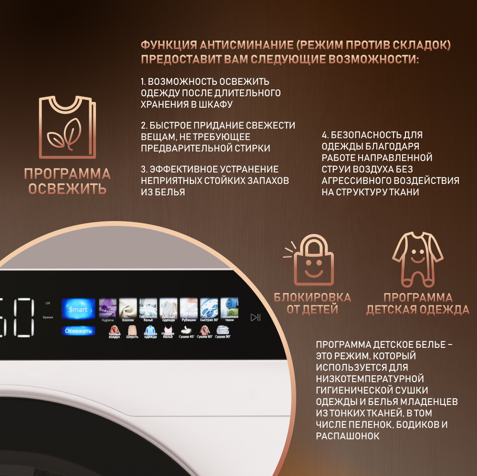 Отдельностоящая сушильная машина Weissgauff, оснащенная тепловой помпой, инверторным двигателем и обработкой ультрафиолетом, имеет фантастический показатель загрузки до 12 килограммов белья, а также инновационный увеличенный цветной дисплей SMART SCREEN с сенсорным управлением, что делает данную модель не только эффективной, но и по-настоящему удобной в работе!