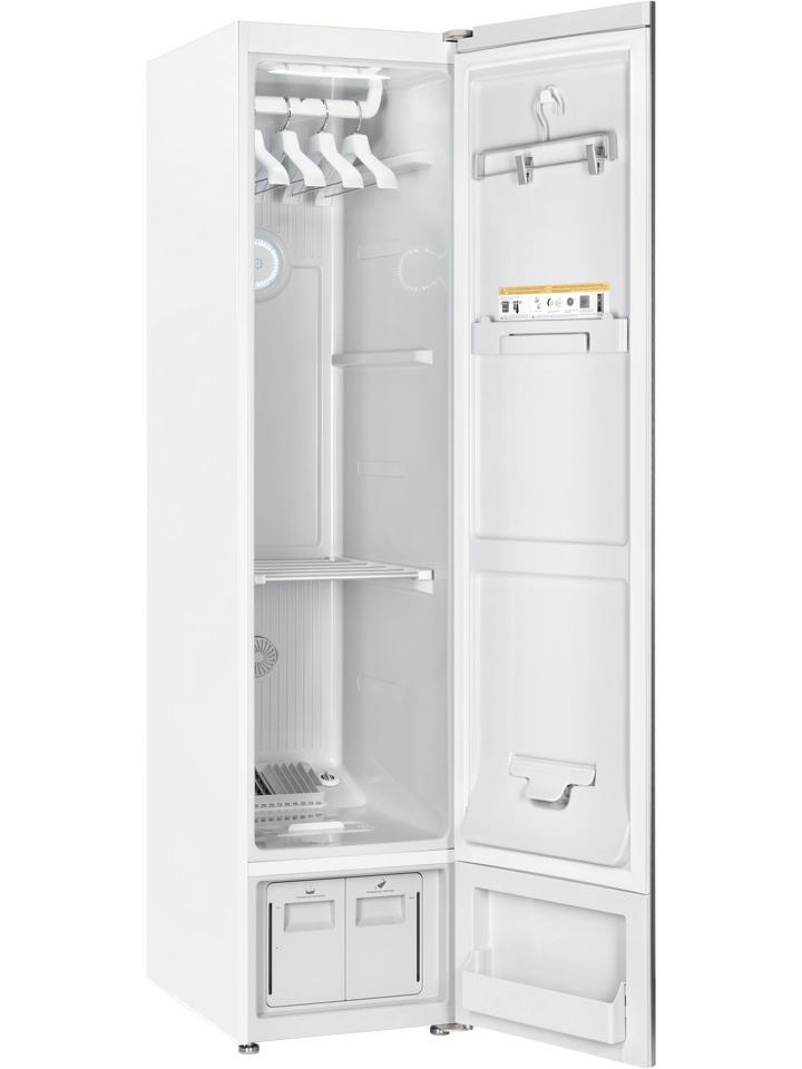 Модель белого цвета с современным лаконичным корпусом и дверью из закаленного стекла идеально впишется в любой интерьер и станет в нем стильным акцентом. А благодаря низкому уровню шума процесс использования парового шкафа будет абсолютно комфортным.