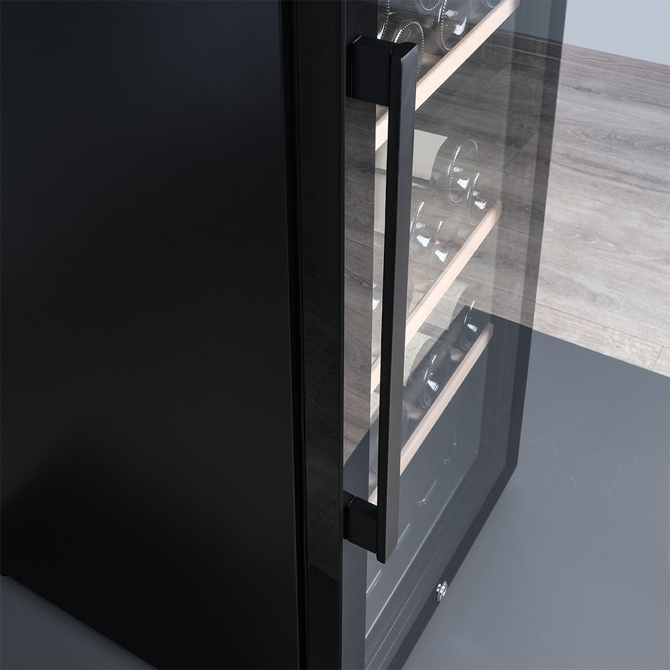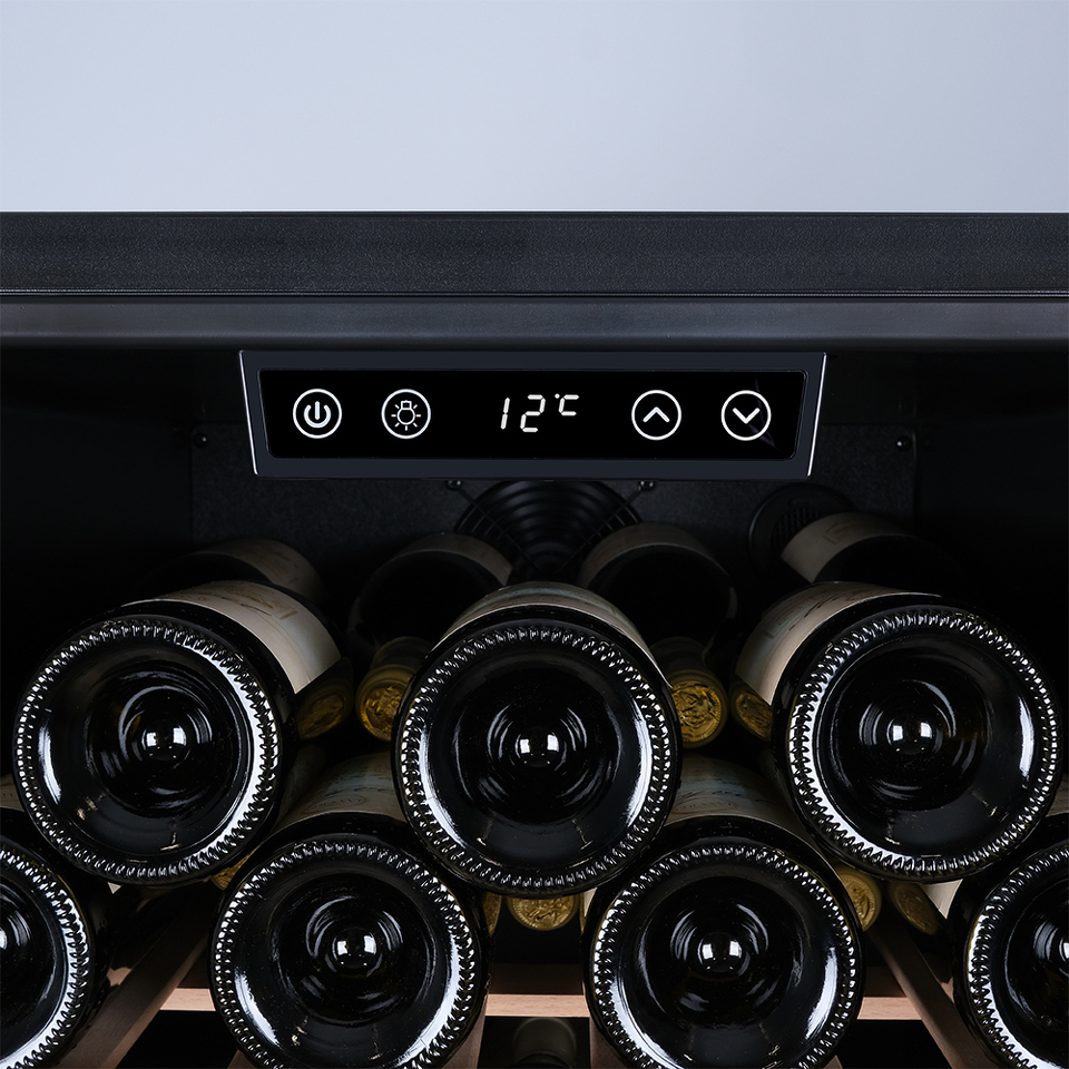 Управление осуществляется через сенсорную панель, а настройка интуитивно понятна. Также предусмотрены важные функции для защиты винотеки: замок на двери для безопасности, угольный фильтр, который очищает воздух внутри шкафа от посторонних запахов, сигнализация отклонения температуры, которая предупреждает о любых изменениях в условиях хранения, и блокировка панели управления, предотвращающая случайные изменения настроек.