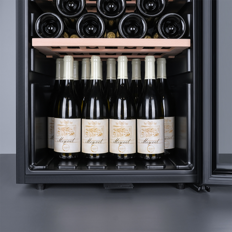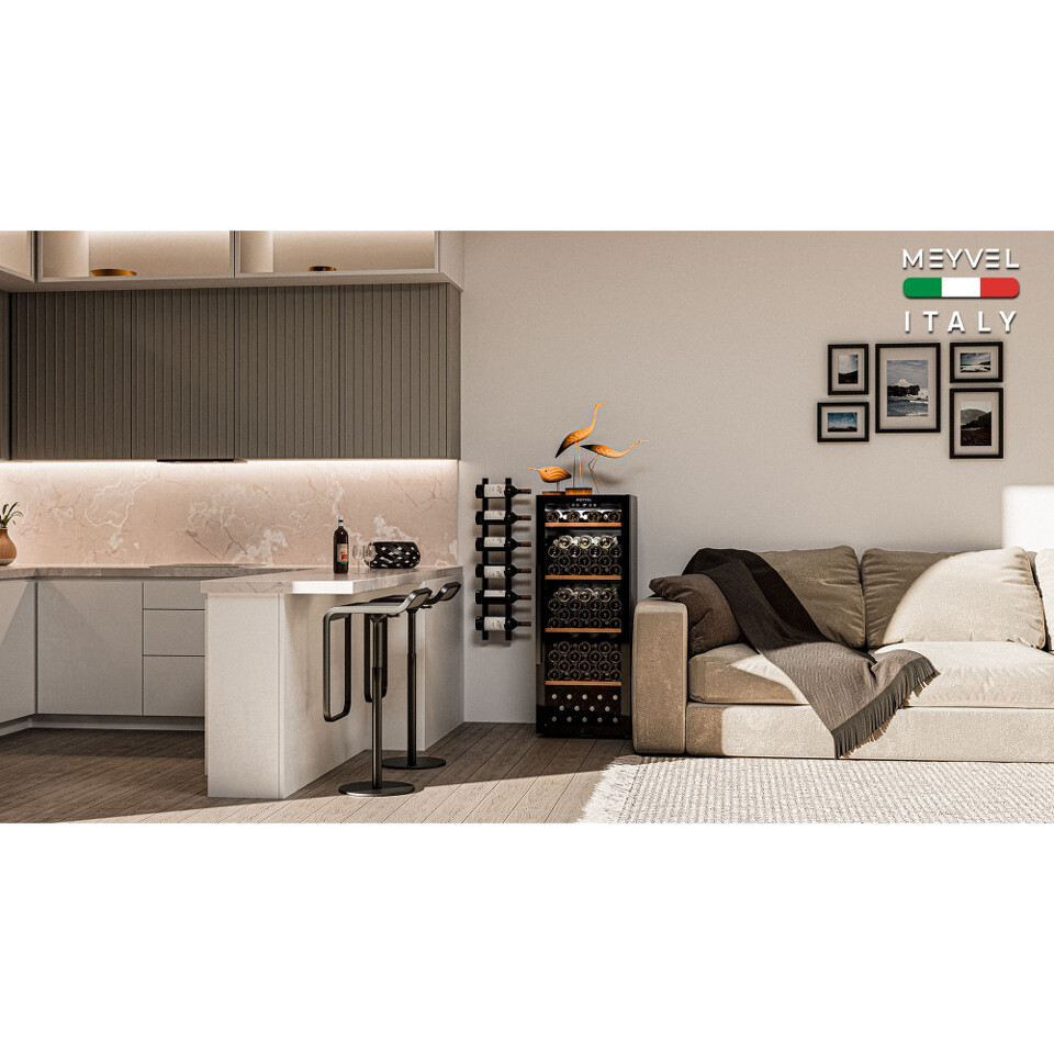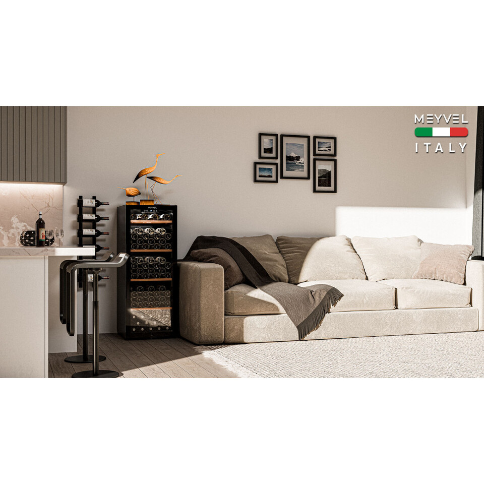 Meyvel MV105-KBF1 — отдельностоящее устройство, поэтому можно разместить его в любом удобном месте ресторана, отеля, бара или домашней винной комнаты без встраивания в мебель. Это удобно не только для создания стиля и атмосферы в интерьере, но и для предоставления легкого доступа к винам.