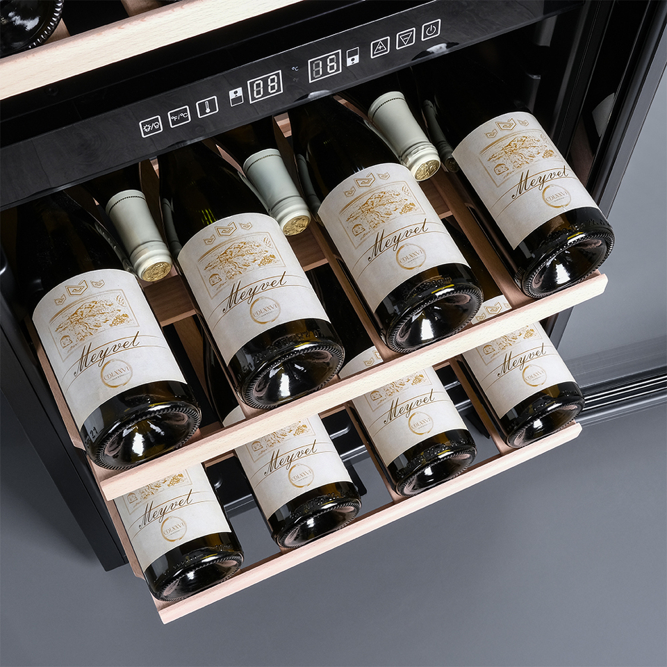 Управление осуществляется через сенсорную панель, а настройка интуитивно понятна. Также предусмотрены важные функции для защиты винотеки: замок на двери для безопасности, угольный фильтр, который очищает воздух внутри шкафа от посторонних запахов, сигнализация отклонения температуры, которая предупреждает о любых изменениях в условиях хранения, и блокировка панели управления, предотвращающая случайные изменения настроек.