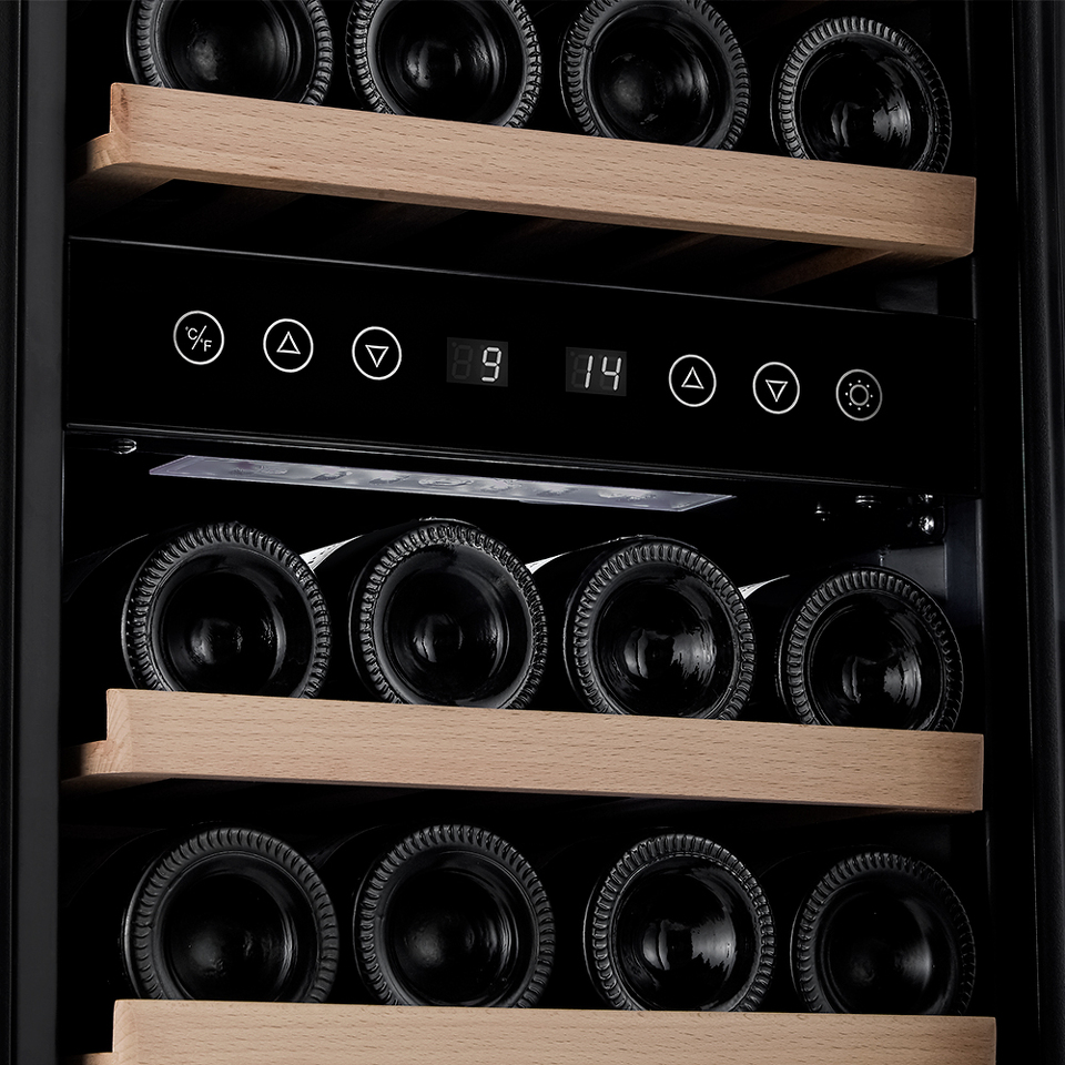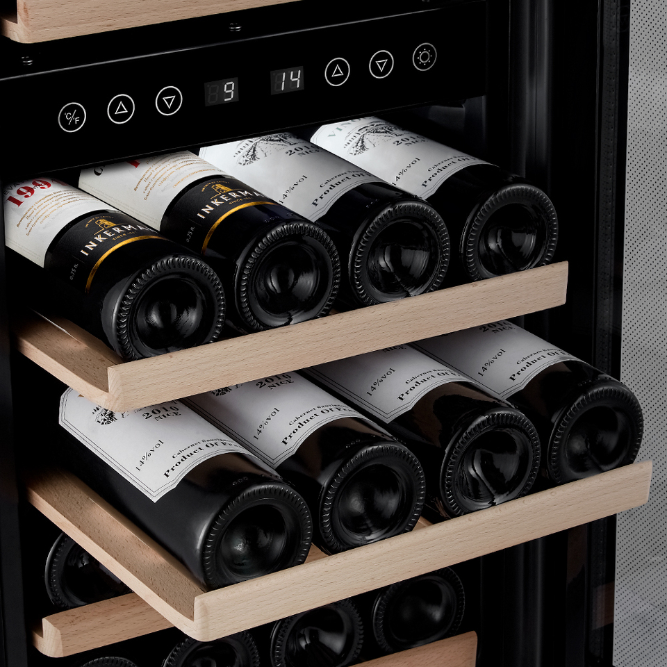 Благодаря продуманному внутреннему исполнению и съемным полкам Вы сможете размещать бутылки любого объема. Внутреннее пространство рассчитано на хранение до 33 бутылок типа Бордо (0,75 л). При желании можно