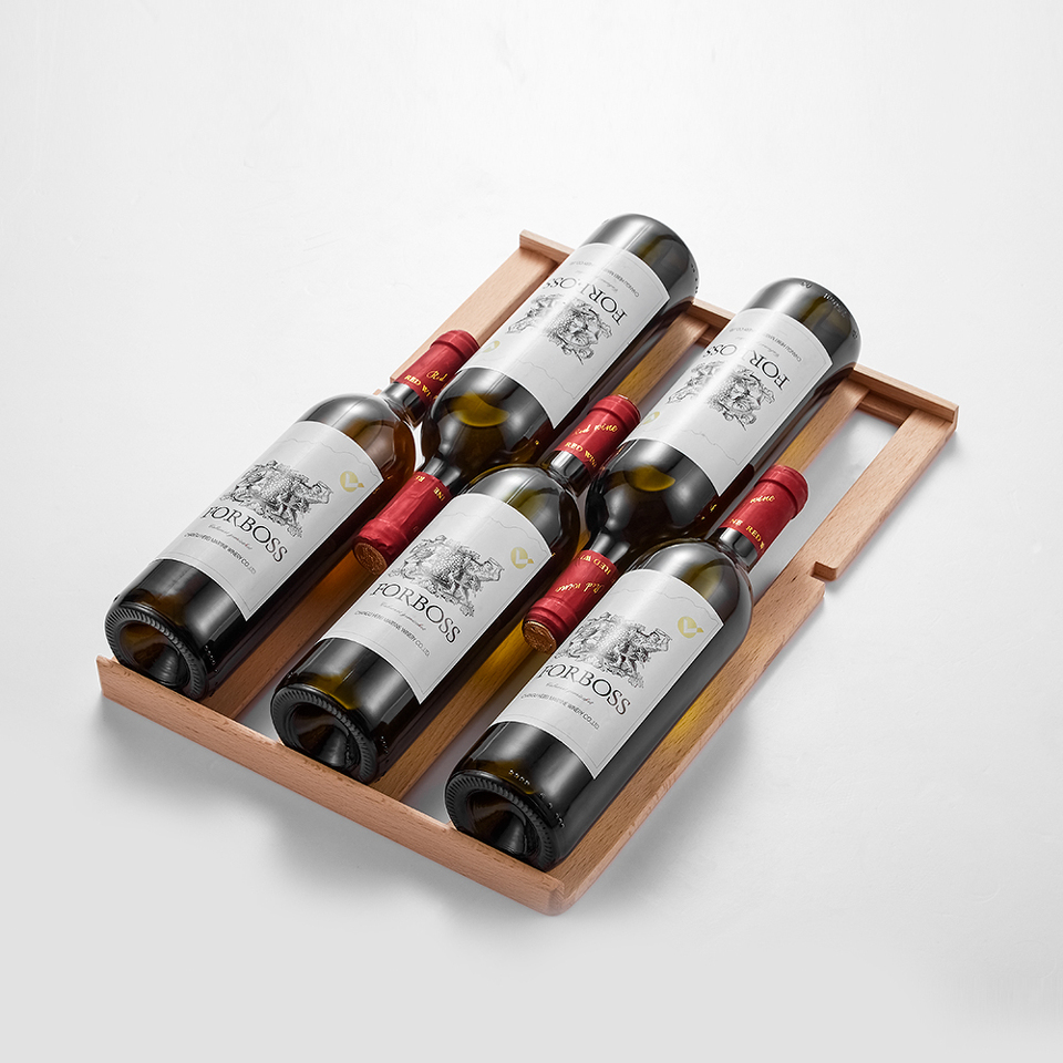 Для размещения винных бутылок, шкаф оснащен 7 крепкими полками из массива бука: выдвижные (5), выдвижные полуполки (2).