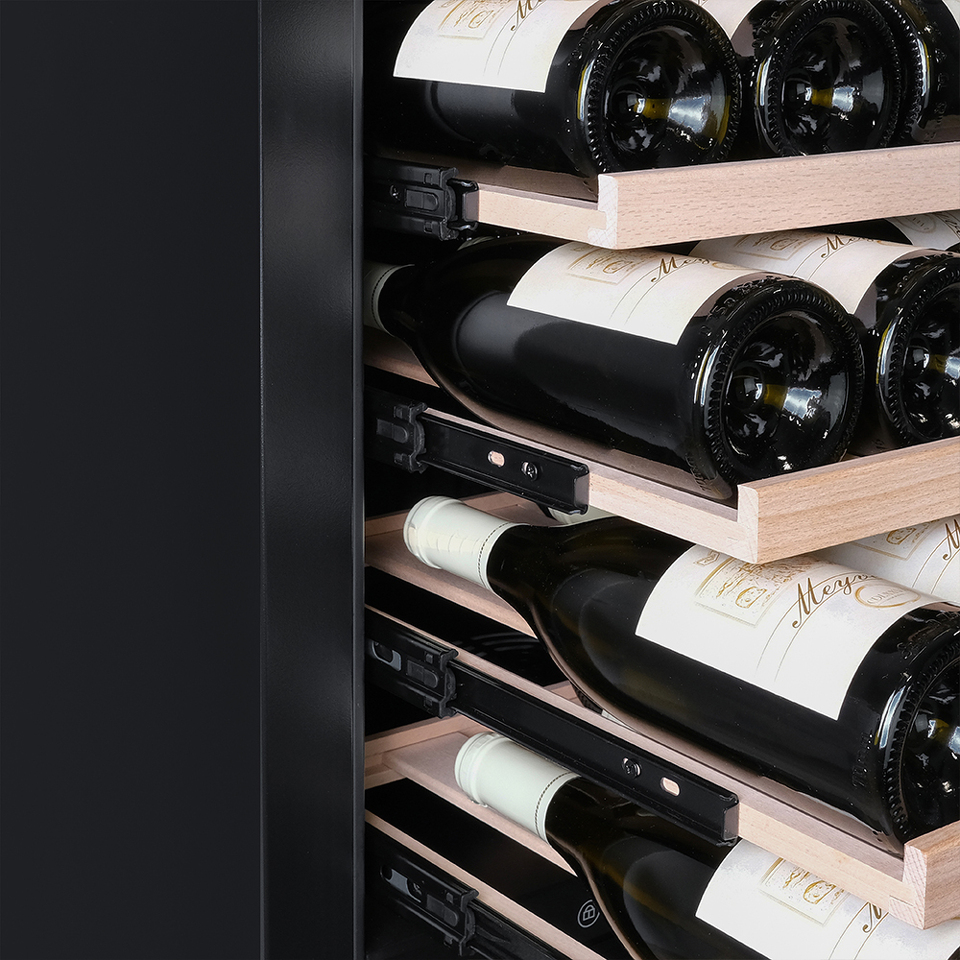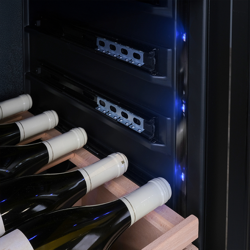 Благодаря увеличенному расстоянию между полками - общая вместимость винного шкафа больше, чем у аналогичных моделей, и на любой полке Вы сможете разместить нестандартные бутылки - например «Магнум».