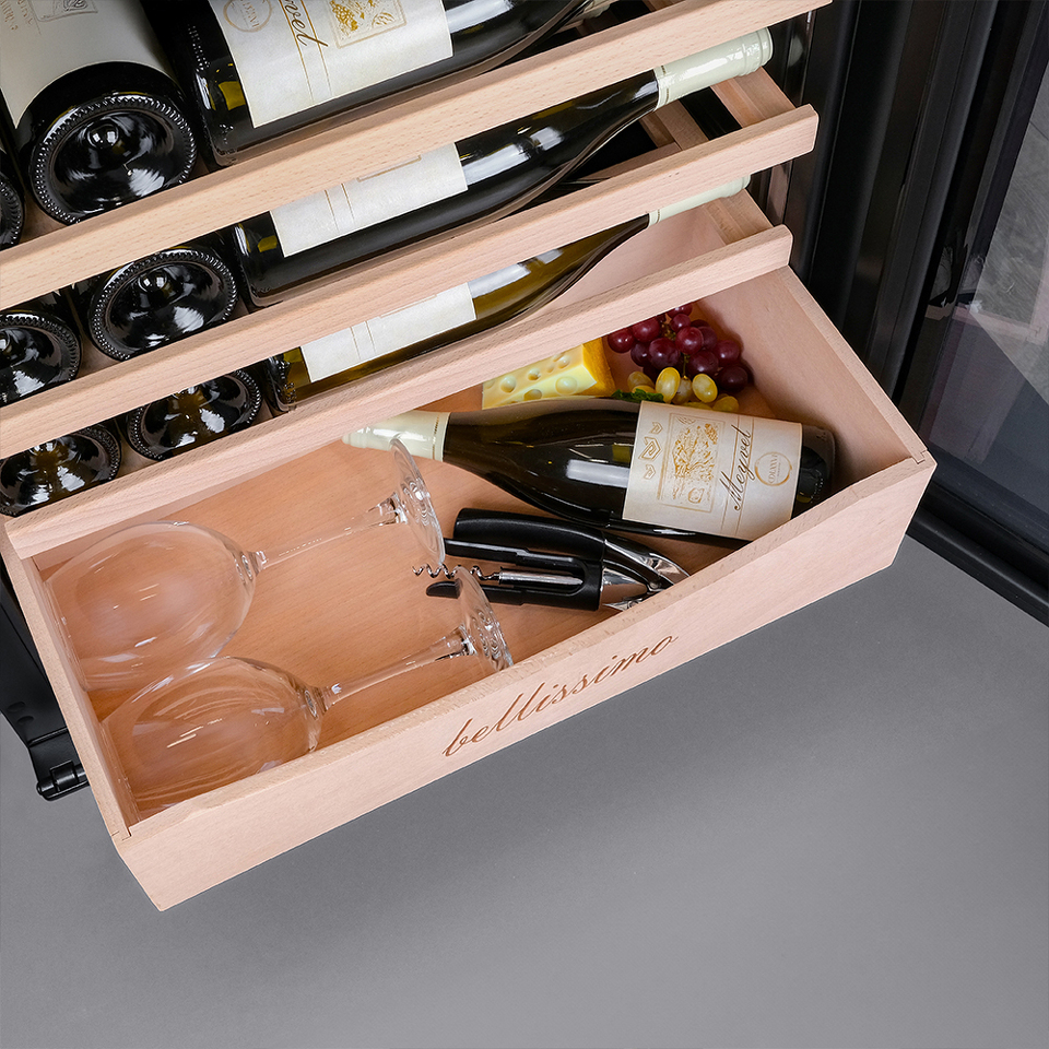Внизу винного шкафа расположен выдвижной ящик - в нем Вы можете хранить вино в бутылках или винные атрибуты (штопор, бокалы, аэраторы, декантеры, каплеуловители, термометры и т.д.).