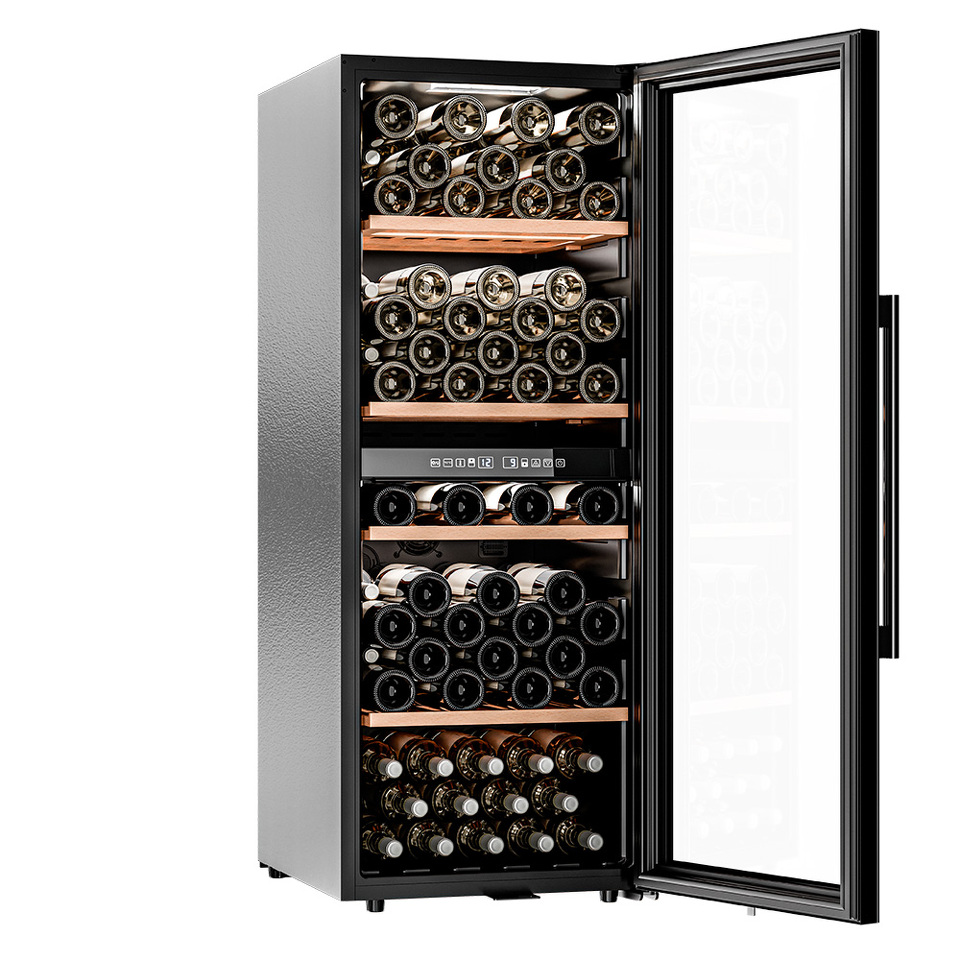 Модель оснащена четырьмя полками из дерева, что не только выглядит стильно, но и способствует правильной циркуляции воздуха внутри шкафа. Двойное стекло с УФ-фильтром надежно защищает вино от вредного воздействия света, что сохраняет его уникальный вкус и аромат.