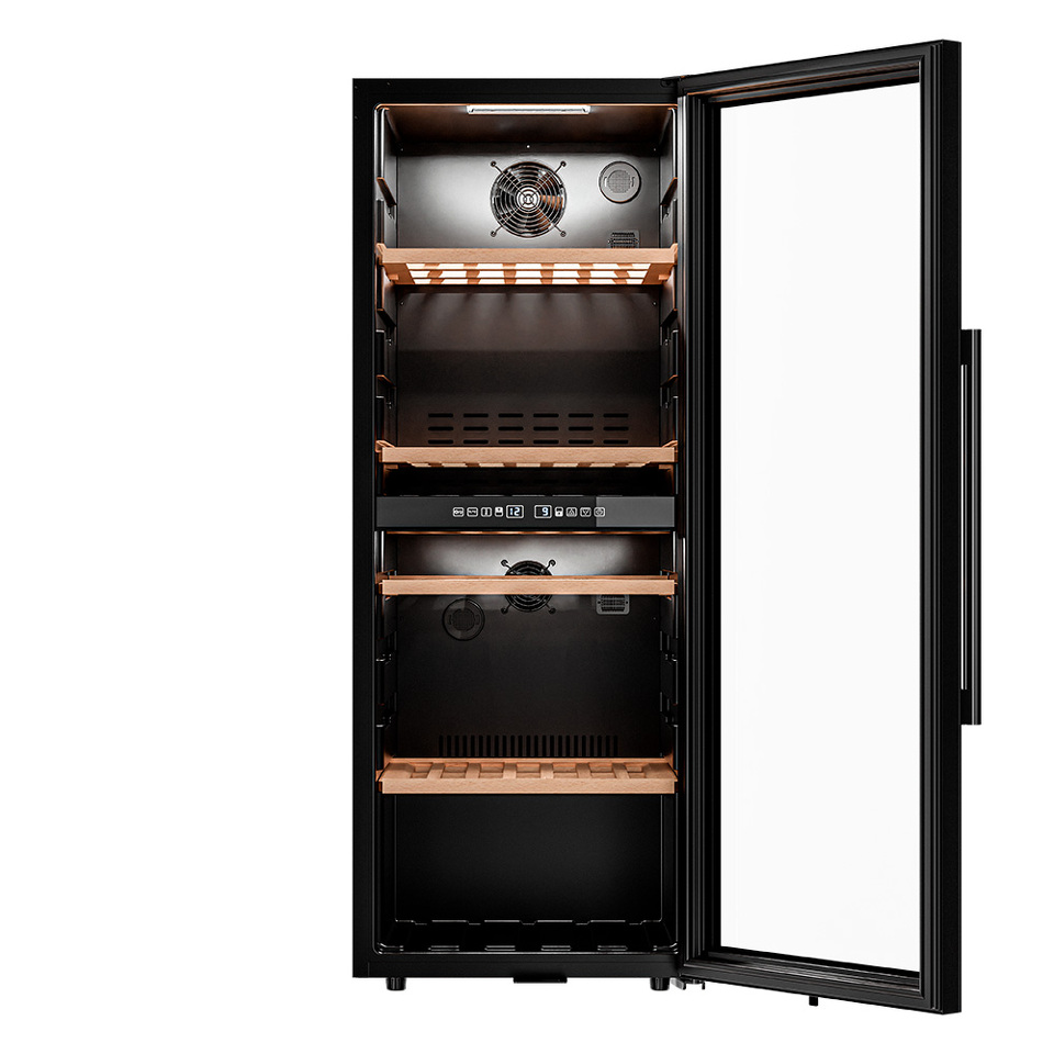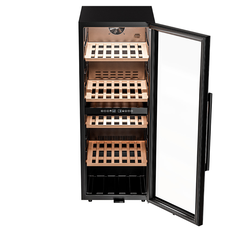 Управление осуществляется через сенсорную панель, а настройка интуитивно понятна. Также предусмотрены важные функции для защиты винотеки: замок на двери для безопасности, угольный фильтр, который очищает воздух внутри шкафа от посторонних запахов, сигнализация отклонения температуры, которая предупреждает о любых изменениях в условиях хранения, и блокировка панели управления, предотвращающая случайные изменения настроек.