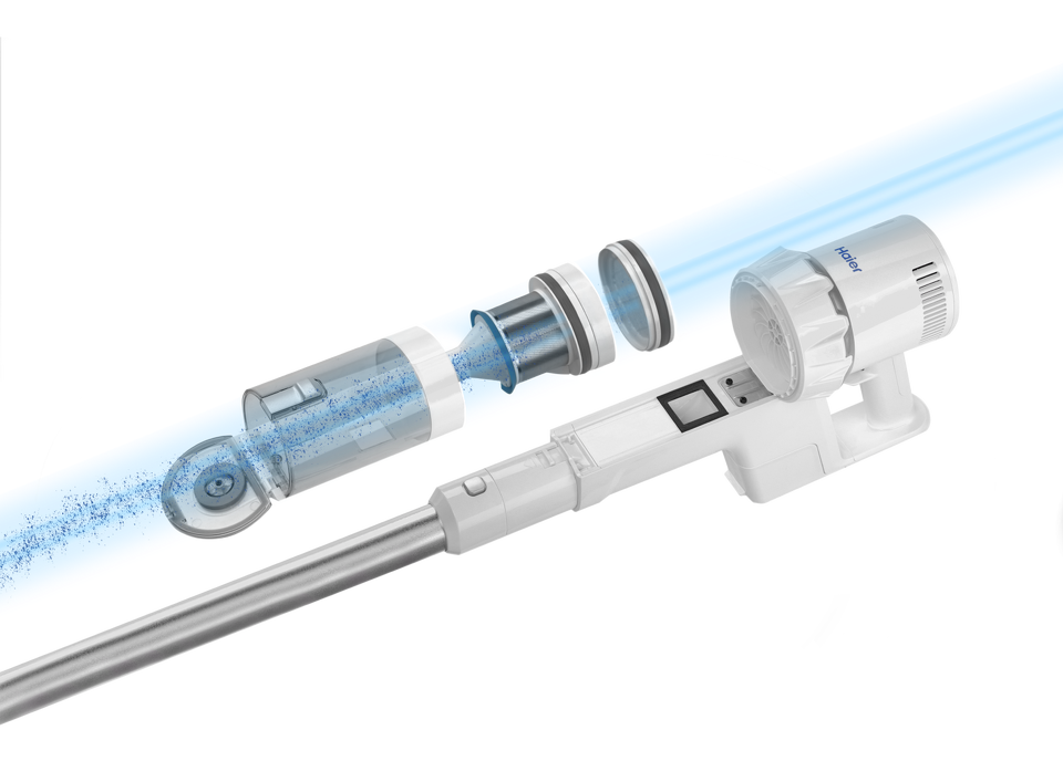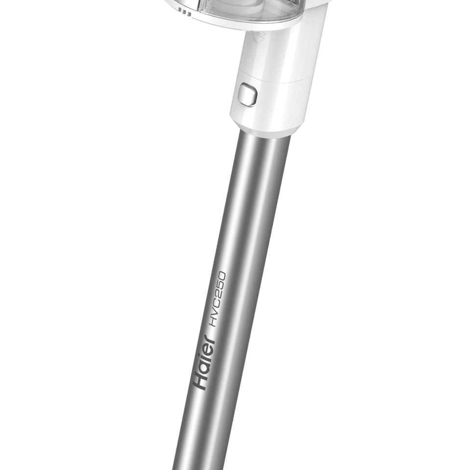 Вертикальный пылесос Haier HVC250 мощностью 250 Вт обладает циклонической системой всасывания с пятью ступенями фильтрации, все фильтры легко снимать для очистки. Двигатель и контейнер для пыли емкостью 500 мл находятся в верхней части устройства. Основная трубка пылесоса сделана из алюминия, кроме нее есть три насадки из поликарбоната и ABS-пластика: гибкая (для труднодоступных мест), щелевая и мягкая. За счет насадок пылесос легко трансформировать в ручной.