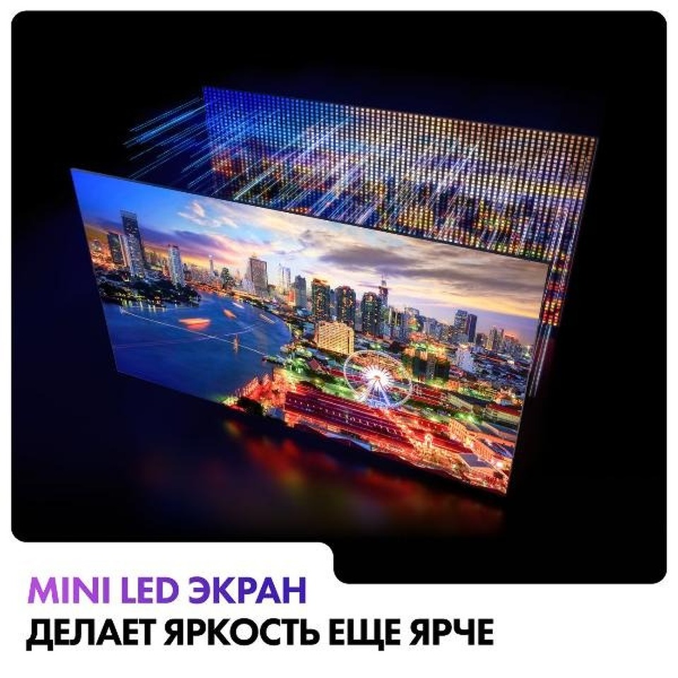 Телевизор Haier 75 Mini LED Pro DH1UDMA01RU обладает 75-дюймовым экраном разрешением 4K Ultra HD (3840x2160 пикселей) и демонстрирует детализированное изображение, которое порадует и киноманов, и геймеров.