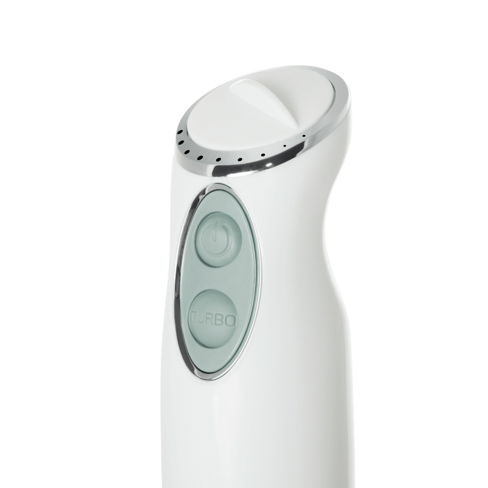 Блендер снабжен двумя прорезиненными клавишами управления, включающих скоростной режим и режим турбо. Скорость плавно регулируется в верхней части блендера. Погружная насадка блендера с двумя ножами также выполнена из нержавейки, что значительно увеличивает ее срок службы, а также позволяет использовать ее для работы с горячими продуктами.