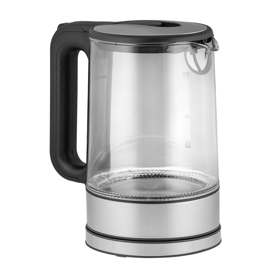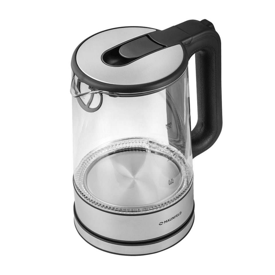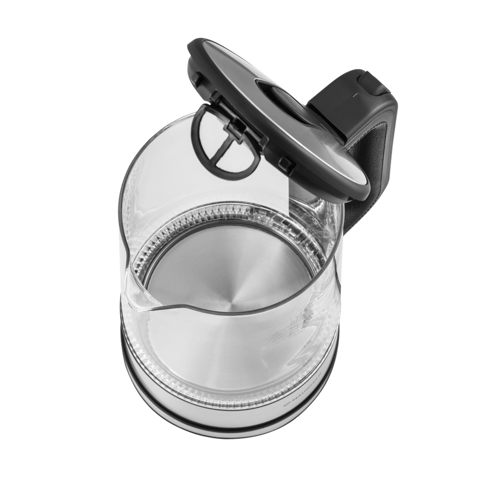 Элегантный чайник мощностью 2 200 Вт и объемом 1,7 л представляет собой идеальную комбинацию металлического основания и колбы из жаропрочного стекла.