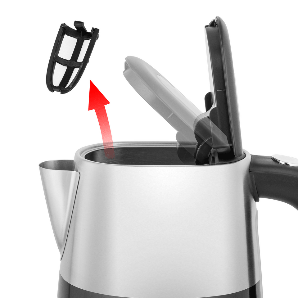На ручке предусмотрена хромированная кнопка автоматического открывания. Окошко с индикатором уровня воды находится непосредственно на корпусе чайника. Кнопка включения/выключения с голубой подсветкой располагается под ручкой В носике крепится съемный фильтр, который легко достается и моется.