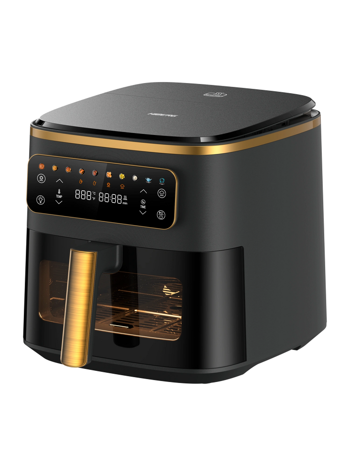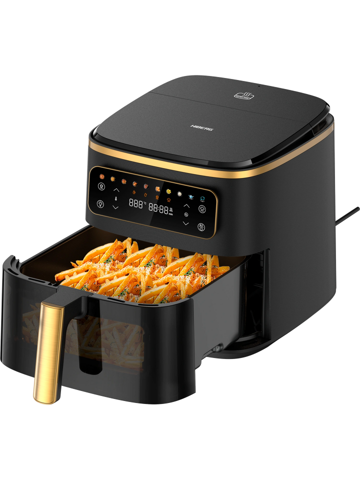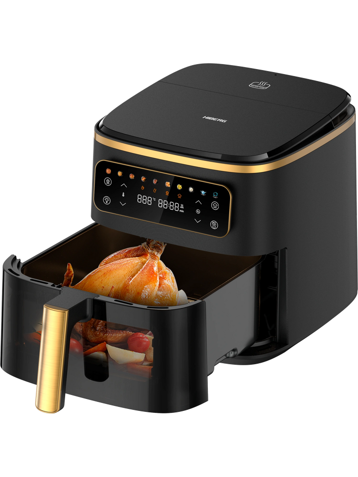 Электрический аэрогриль выполнен в стильном черном цвете с золотом. Большое прозрачное окно и внутренняя LED-подсветка чаши дают возможность наблюдать за процессом готовки без остановки программы.