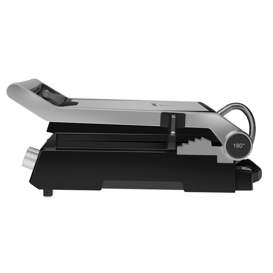 С приоткрытой крышкой. Стоит использовать, если верхняя крышка может раздавить пищу собственным весом, либо куски пищи имеют неравномерную толщину, Просто выберите требуемый угол наклона крышки на фиксаторе, расположенном около кнопки «180».