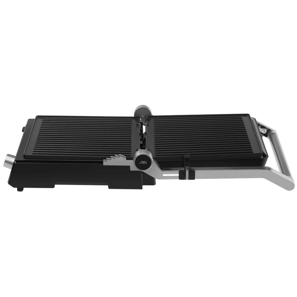 Односторонний режим. Вам достаточно нажать кнопку «180» и откинуть крышку гриля. В один момент вы увеличите площадь жарящей поверхности в два раза.