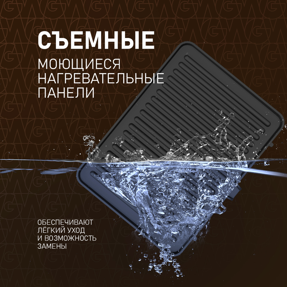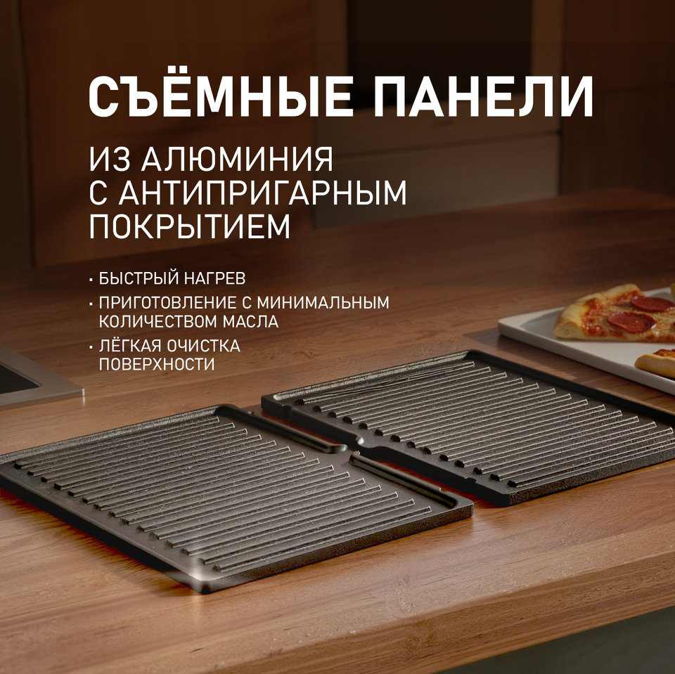 Максимальный угол раскрытия 180 градусов позволяет работать с данным устройством не только в режиме гриля, но и в режиме барбекю! Используйте сразу обе нагревательные панели в полностью раскрытом режиме, чтобы увеличить площадь приготовления!