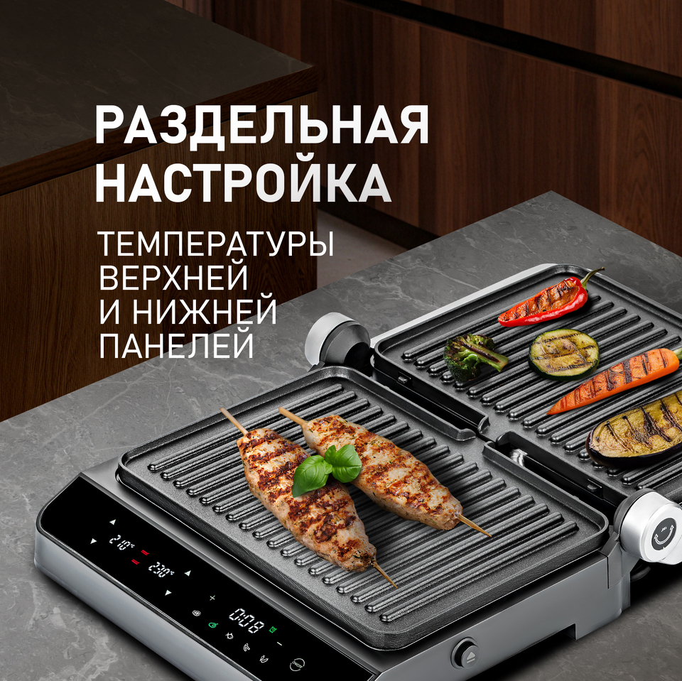 Съемные моющиеся нагревательные панели с антипригарным покрытием позволят не только эффективно распределять тепло, обеспечивая непревзойденное качество прожарки, но и сделать уход и очищение вашего гриля по-настоящему легким и простым!