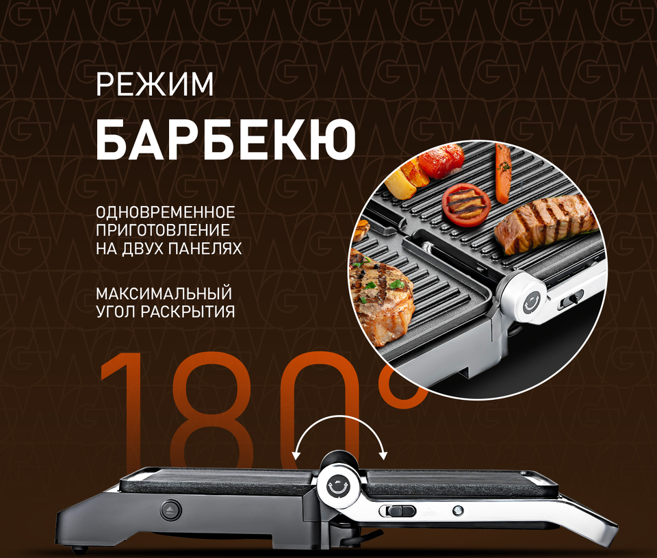 Максимальный угол раскрытия 180 градусов позволяет работать с данным устройством не только в режиме гриля, но и в режиме барбекю! Используйте сразу обе нагревательные панели в полностью раскрытом режиме, чтобы увеличить площадь приготовления!