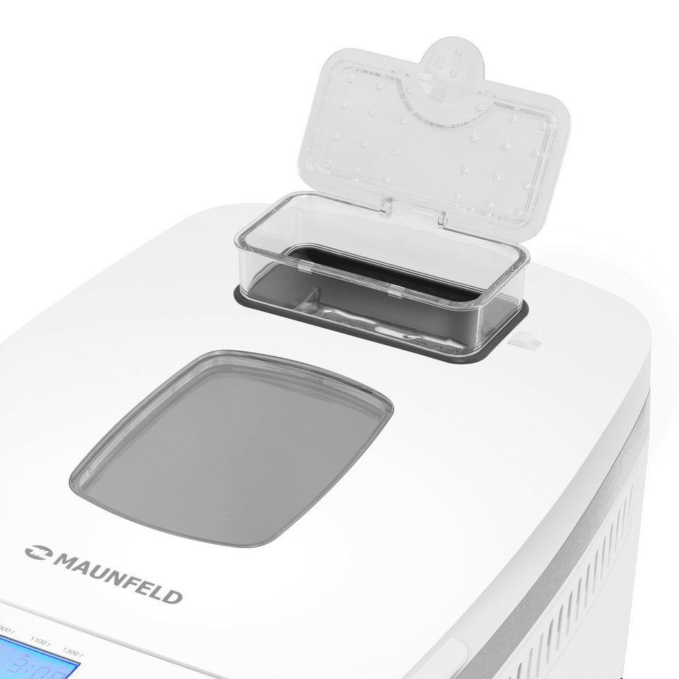 Хлебопечь MAUNFELD оснащена удобным диспенсером. Начинка автоматически будет добавлена в тесто на нужном этапе замеса.