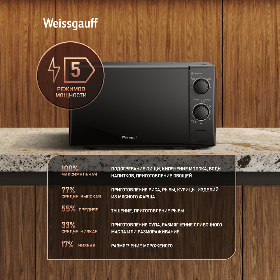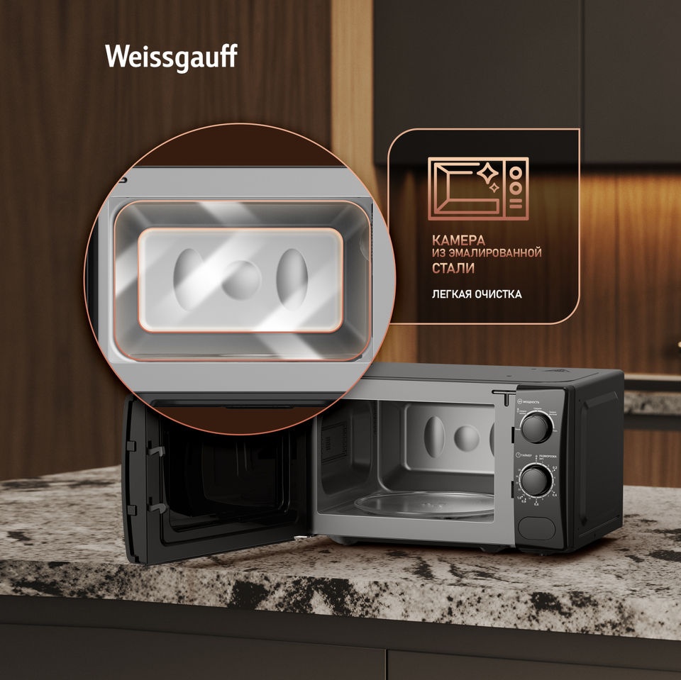 Микроволновая печь Weissgauff с объемом 20 литров, выполненная в черном цвете, оснащённая механическими поворотными рукоятками Soft Switch, равномерно разогревает еду при помощи поворотного стола!
