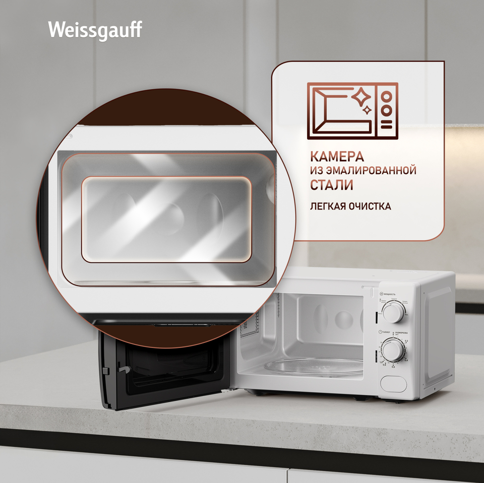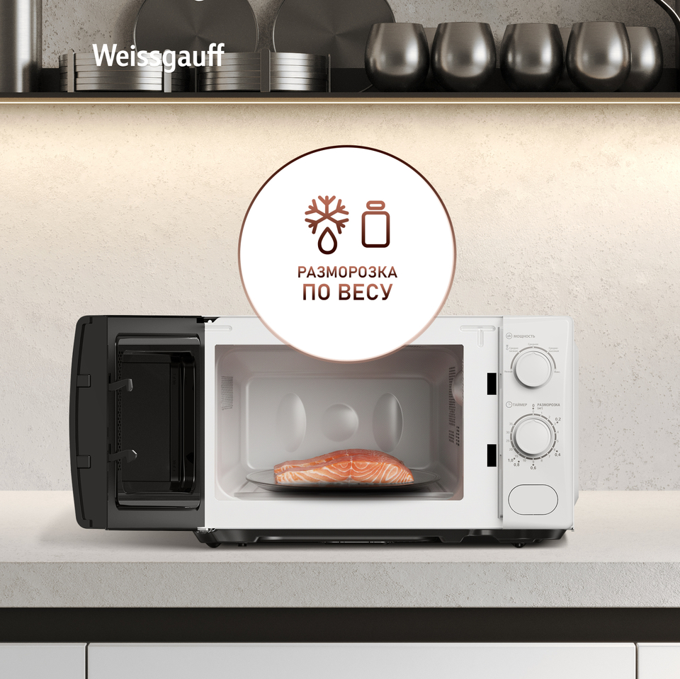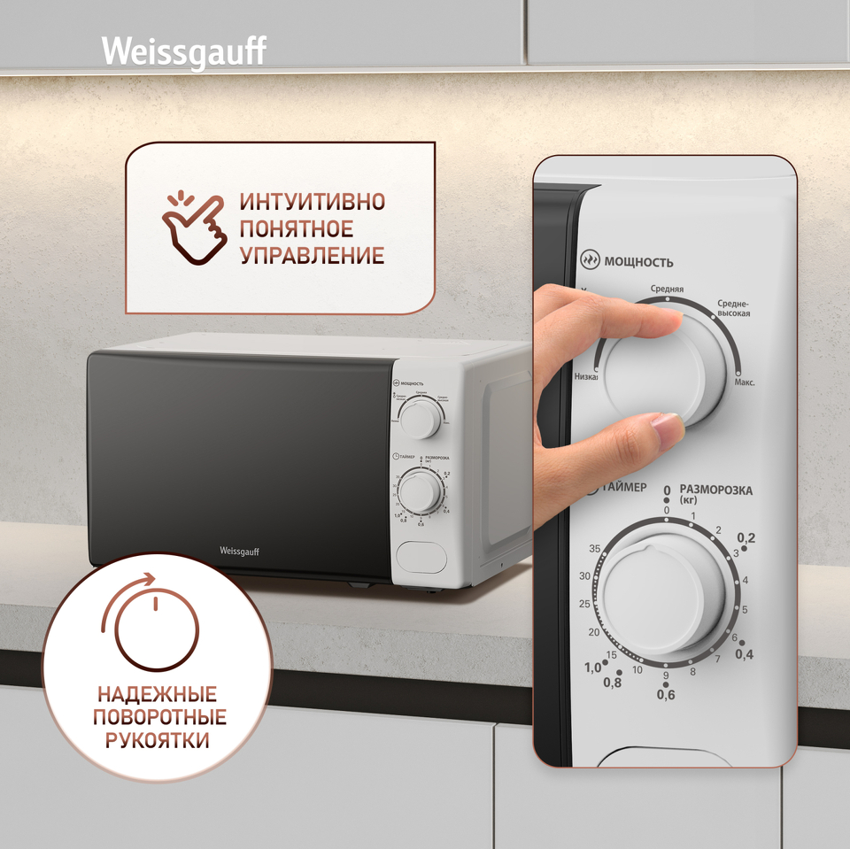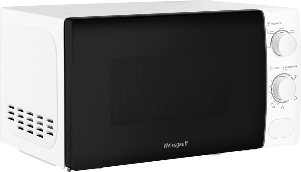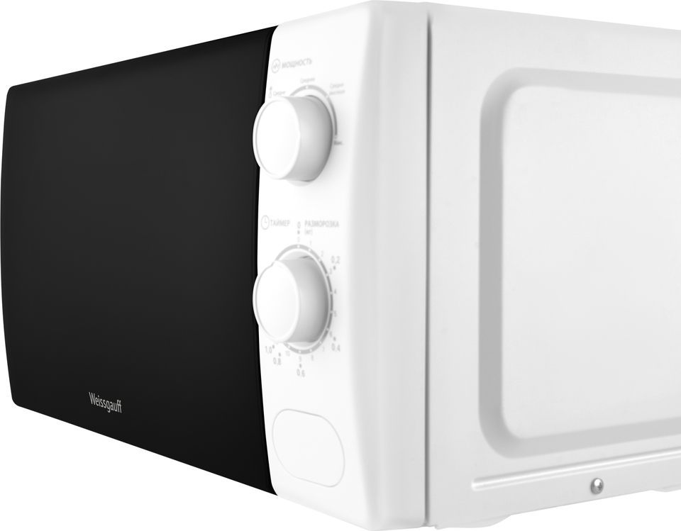Микроволновая печь Weissgauff с объемом 20 литров, выполненная в белом цвете, оснащённая механическими поворотными рукоятками Soft Switch, равномерно разогревает еду при помощи поворотного стола!