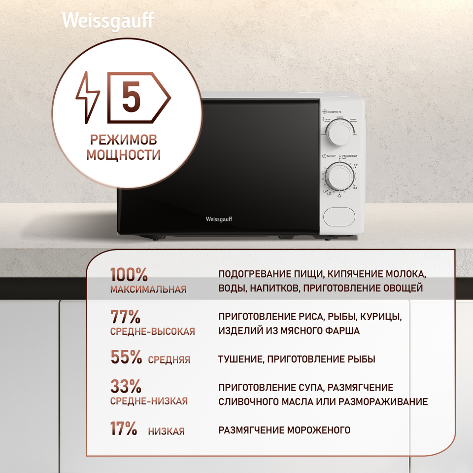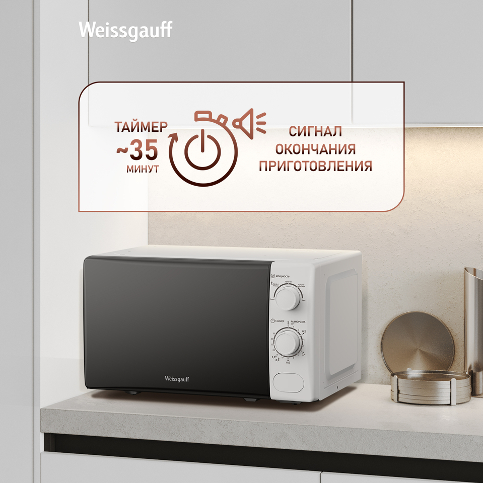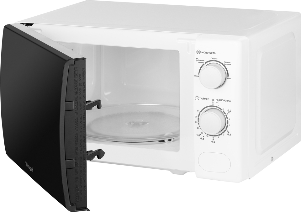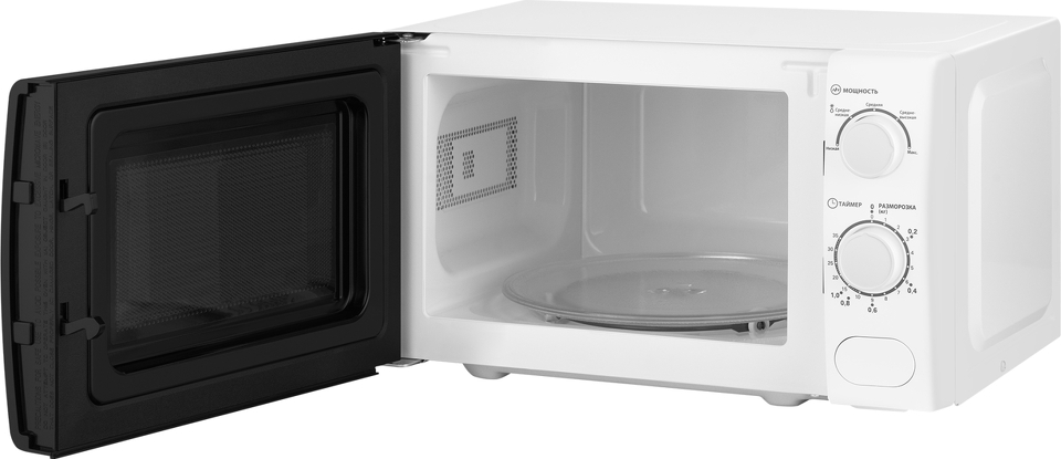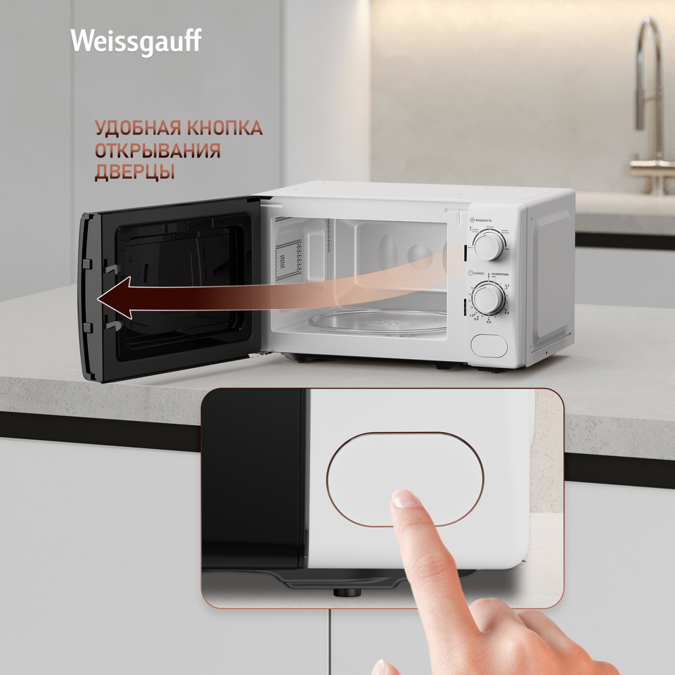 Микроволновая печь Weissgauff с объемом 20 литров, выполненная в белом цвете, оснащённая механическими поворотными рукоятками Soft Switch, равномерно разогревает еду при помощи поворотного стола!