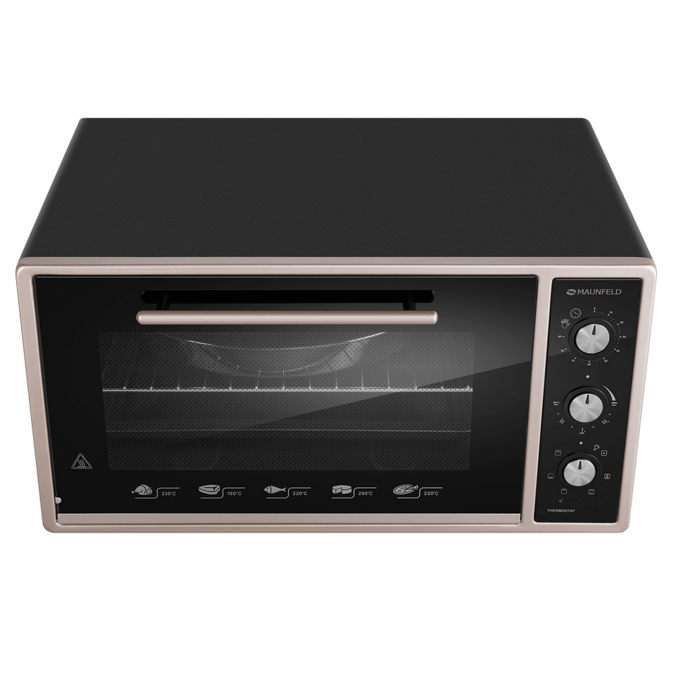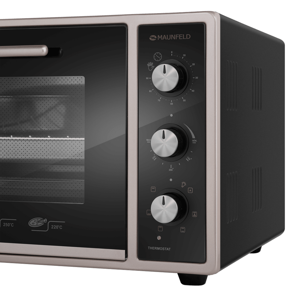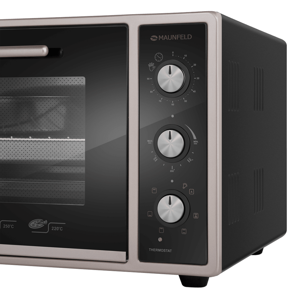 Полезный объем мини-печи довольно большой – целых 45 литров, готовить можно одновременно на 3 уровнях. Вы можете использовать традиционный верхний и нижний нагрев, комбинируя их с функциями конвекции и гриля. Всего предусмотрено 7 функций приготовления. Благодаря яркой подсветке можно хорошо рассмотреть содержимое всех противней и контролировать процесс готовки, не открывая дверцу. Мини-печь оснащена таймером, автоматически отключающим прибор по окончании времени приготовления.Утапливаемые поворотные ручки PUSH PULL.