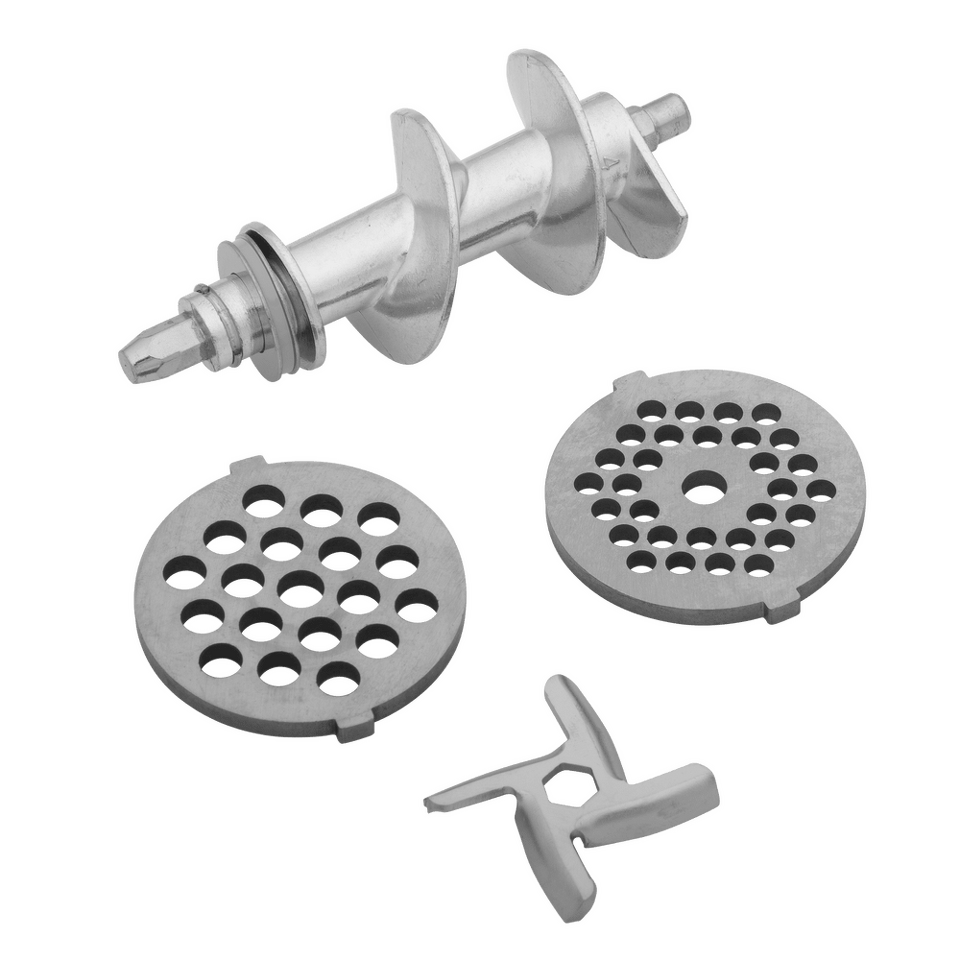Сама насадка-мясорубка выполнена полностью из металла и укомплектована 4 насадками для различных целей: 2 решетки для изготовления фарша, а также специальные насадки для колбас и кеббе.