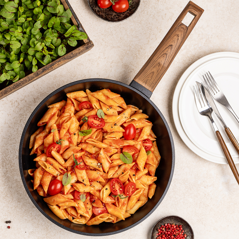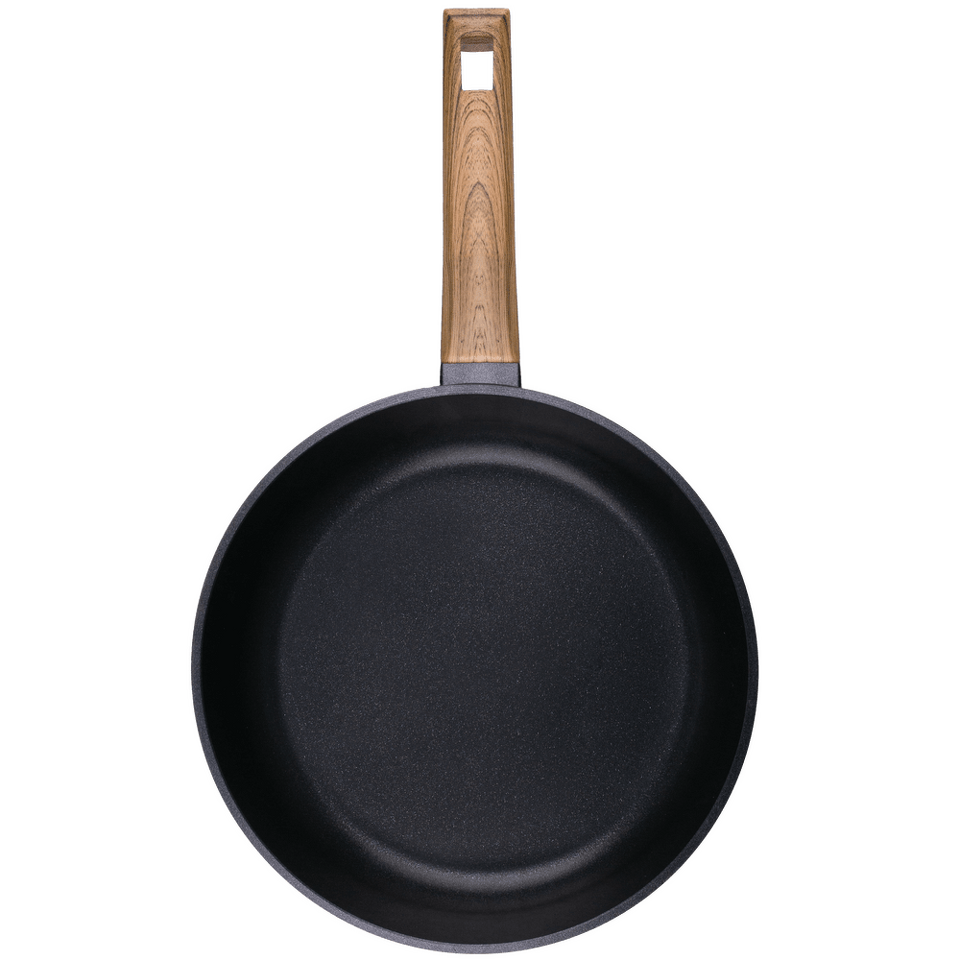 Элегантная сковорода в классическом черном цвете и ручкой из бакелита с отделкой под дерево, подойдет под любой интерьер кухни. Современные и стильные формы- мы учли все мировые тенденции, чтобы посуда была 100% экологичной и стильной.
