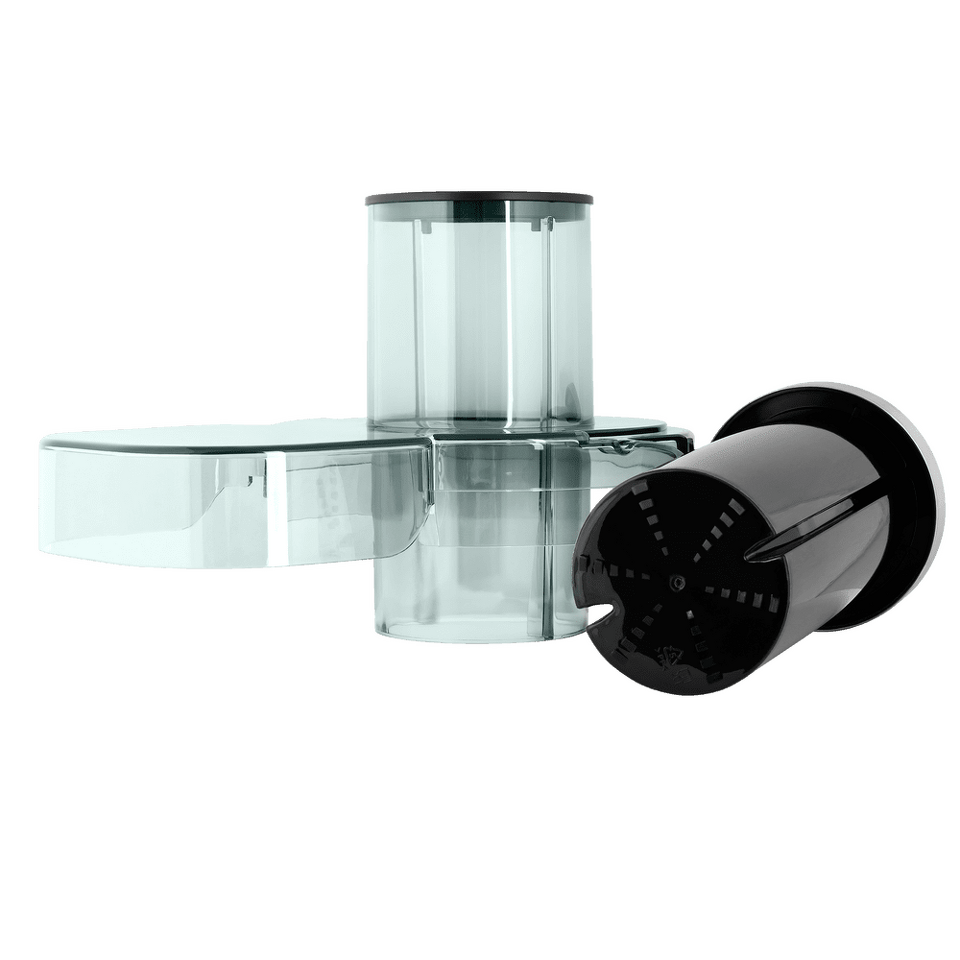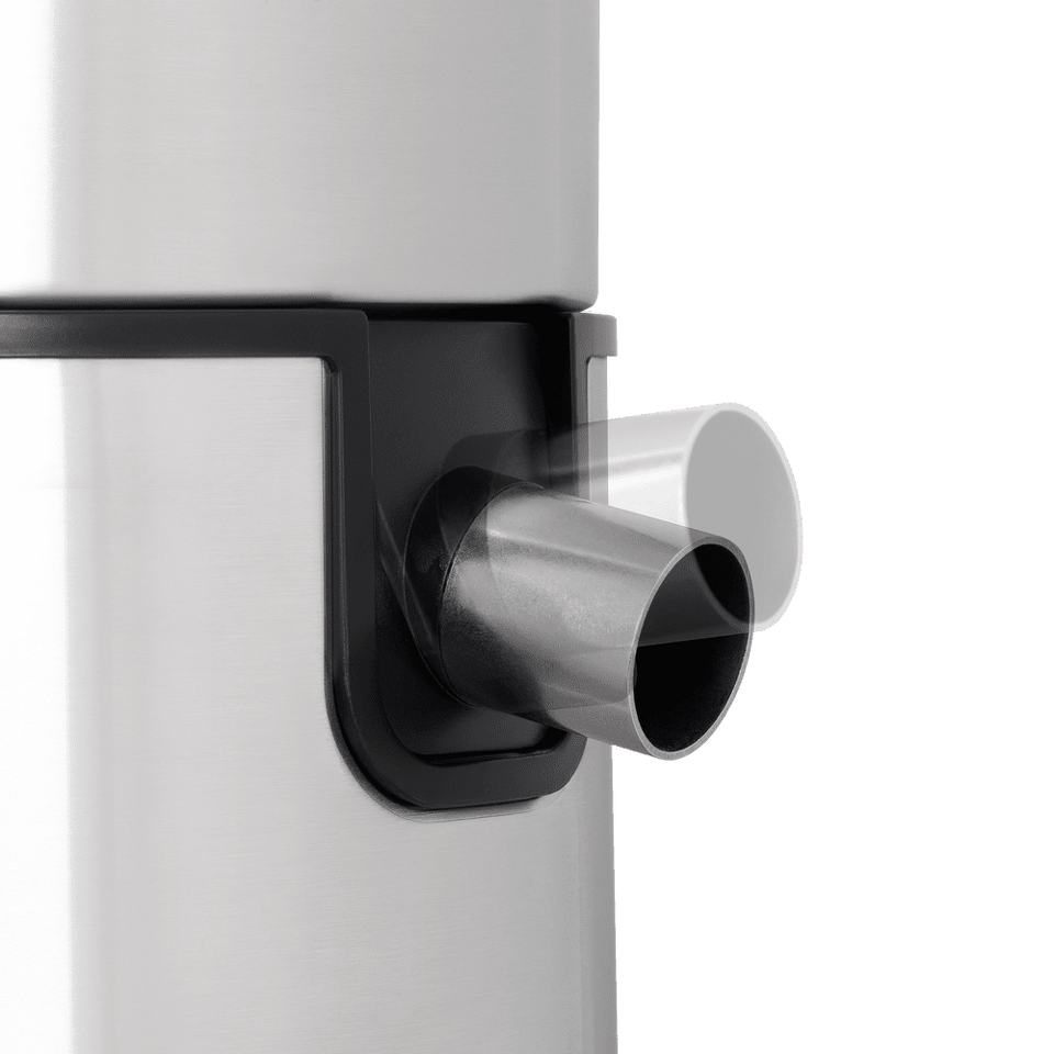 Черный контейнер для мякоти объемом 2,5 л сделан из высокотехнологичной пластмассы легко отсоединяется после использования и моется. Толкатель также сделан из черной пластмассы, чтобы со временем не терять свой внешний вид под воздействием соков.
