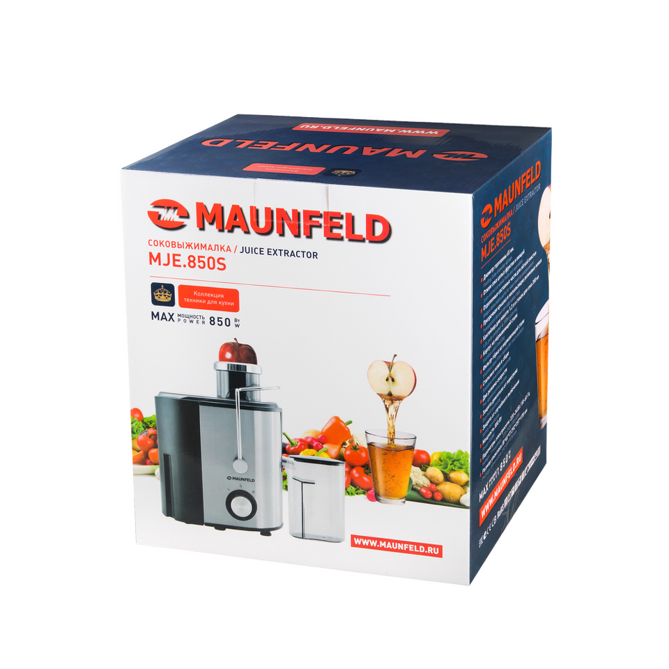 Элегантная соковыжималка мощностью 850 Вт, выполненная из нержавеющей стали, прекрасно впишется в интерьер вашей кухни. Диаметр горловины составляет 65 мм.