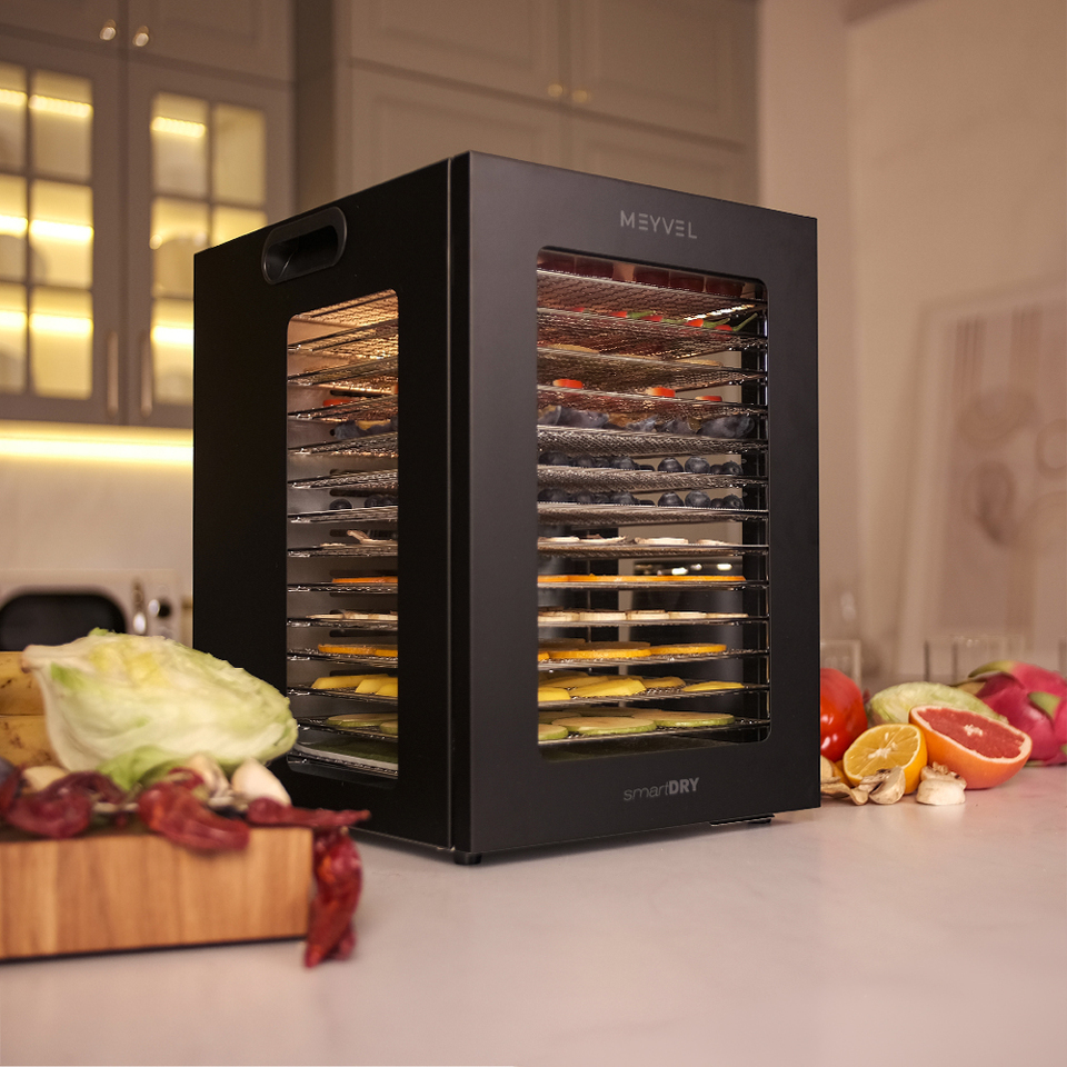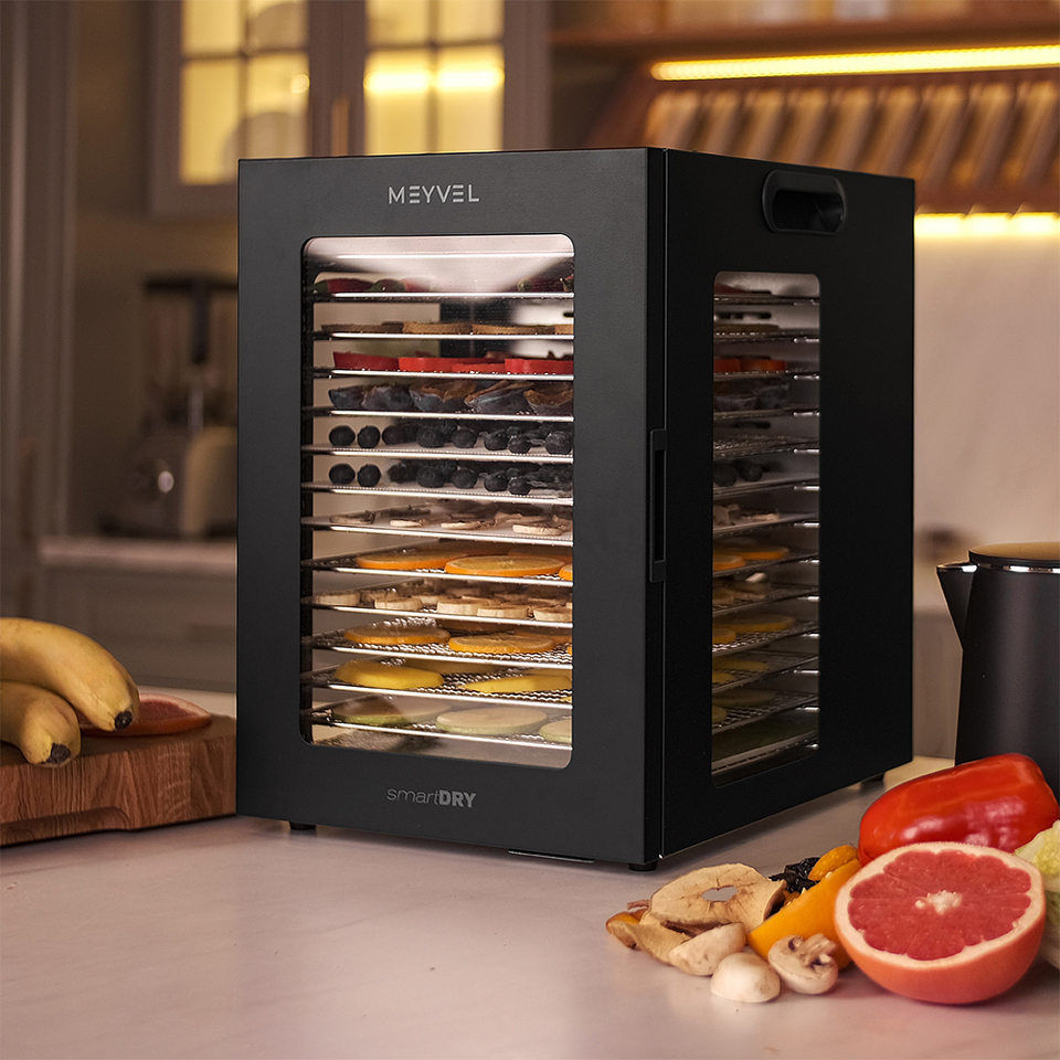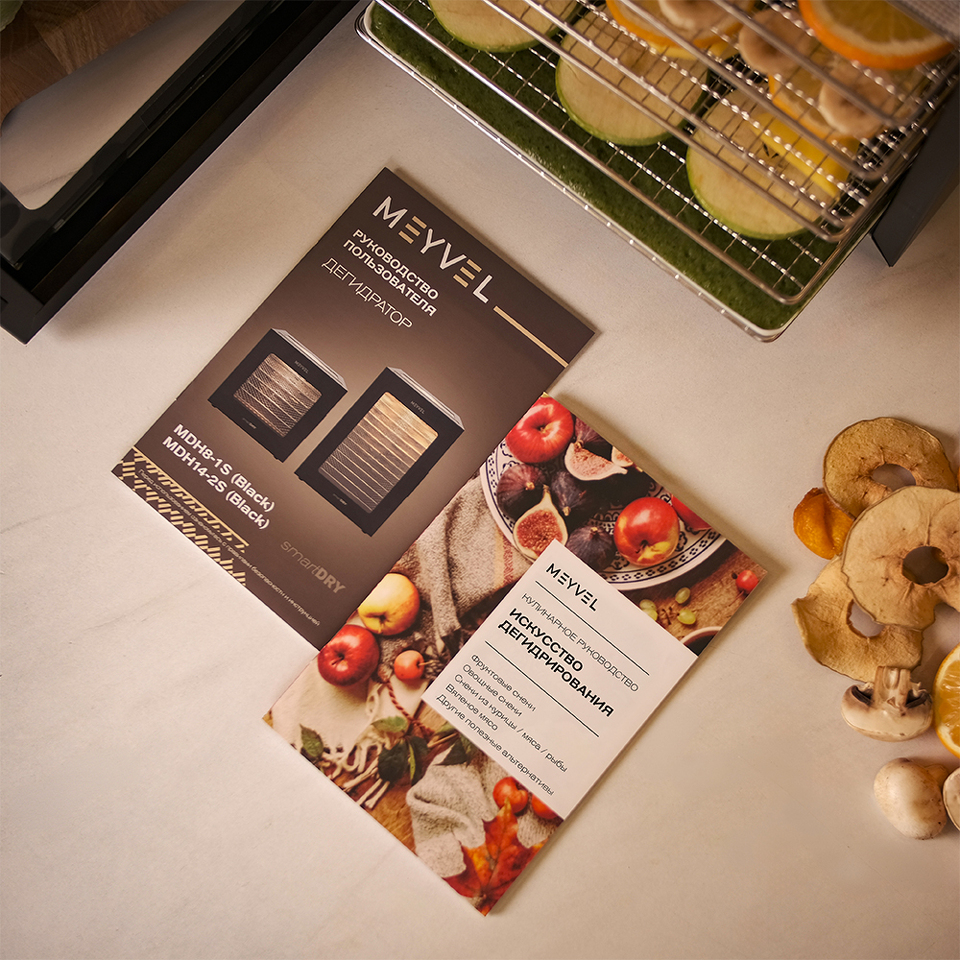 Дегидратор Meyvel MDH14-2S (Black) создан для тех, кто предпочитает натуральные продукты и хочет сам контролировать процесс их приготовления. Он легко высушивает фрукты, овощи, мясо, зелень или готовит домашние снеки — без сахара, добавок и консервантов.