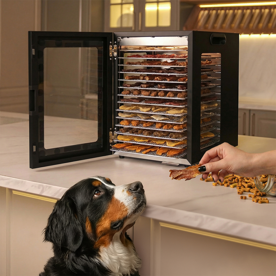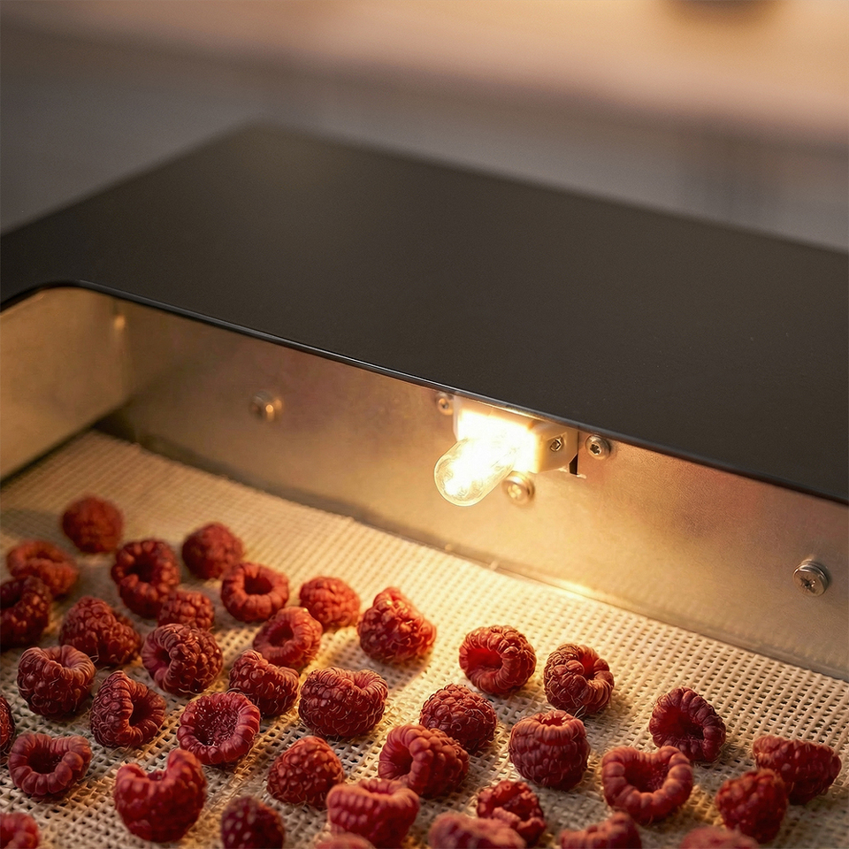 За процессом можно наблюдать через жаропрочное стекло, а встроенная подсветка помогает контролировать сушку даже при слабом освещении в помещении. Для удобства перемещения предусмотрены боковые ручки.