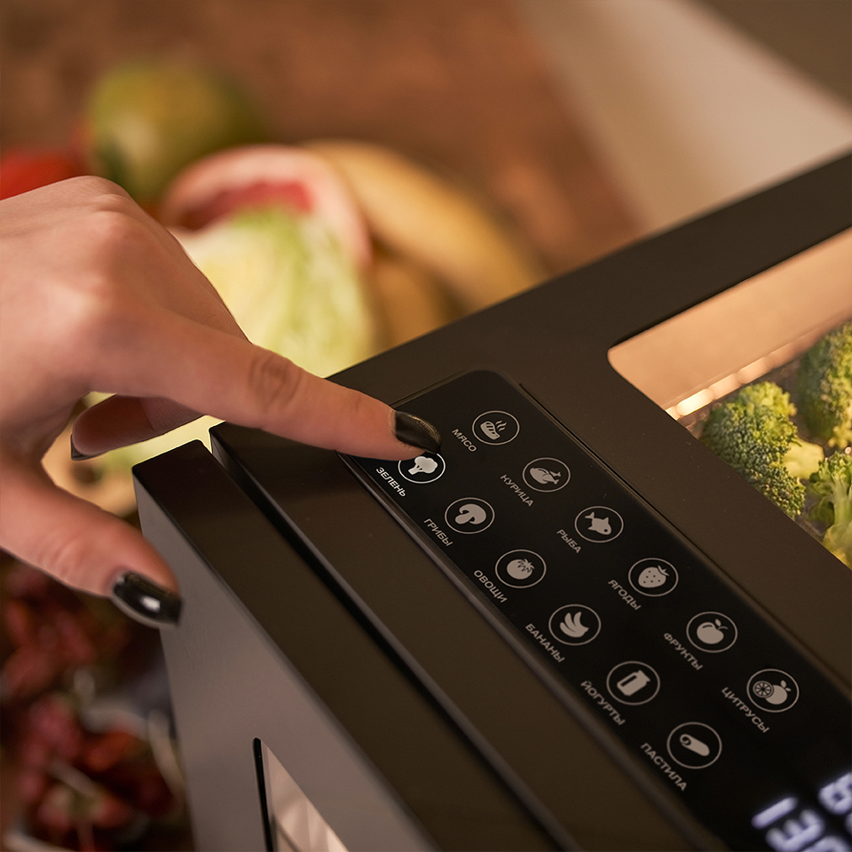 Для удобства пользователя предусмотрены автоматические программы: просто выберите нужный режим, нажав на соответствующую кнопку, и дегидратор сам подберёт оптимальные параметры для фруктов, овощей, мяса или трав.