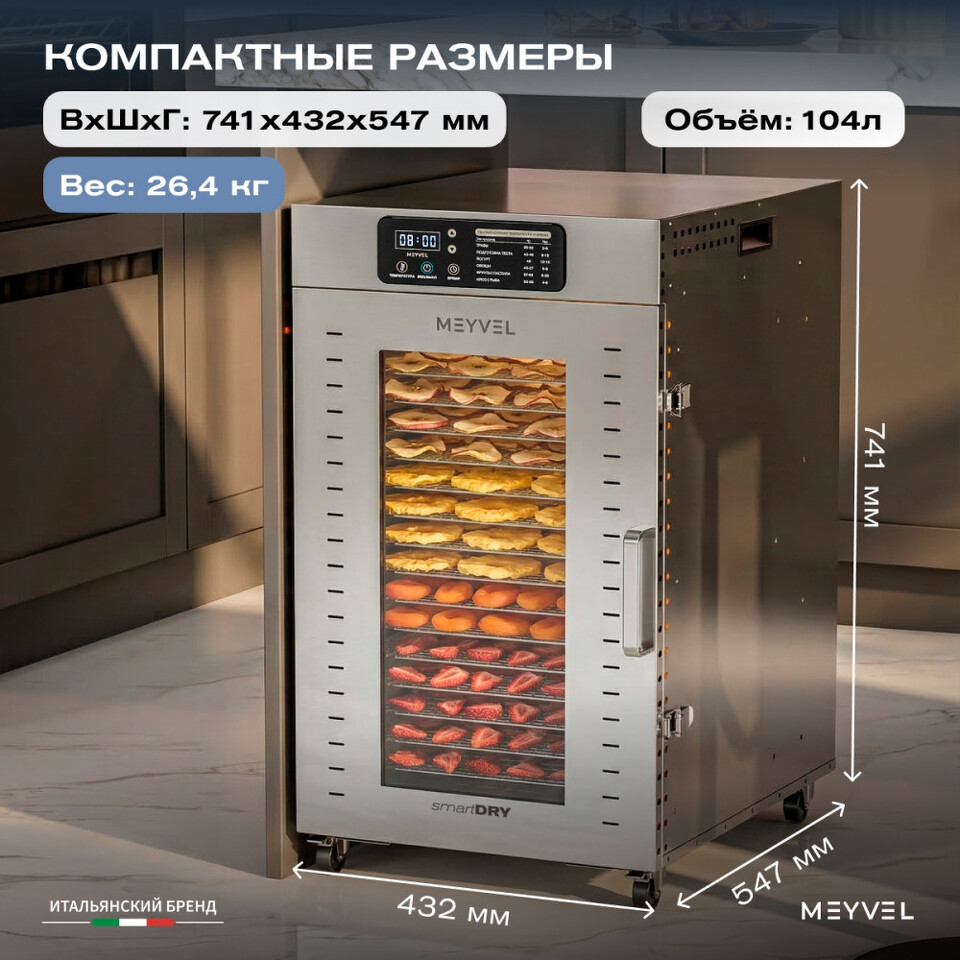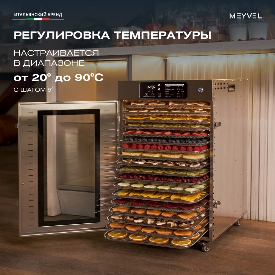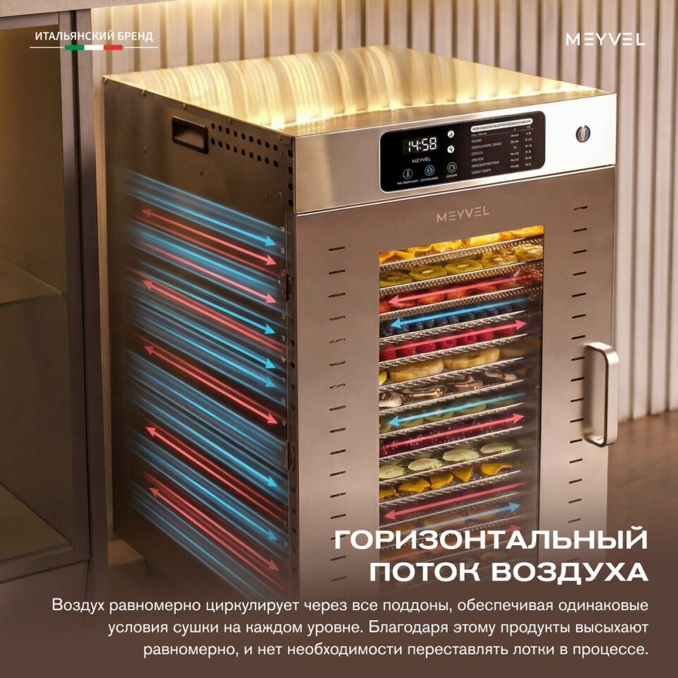 Meyvel MDH18-1S (Нержавеющая Сталь) (Inox) на 25 кг — это мощный дегидратор из нержавеющей стали для бережного высушивания продуктов без потери их вкуса, цвета и пользы. Он функционален, как профессиональная техника, и удобен, как простое домашнее устройство.