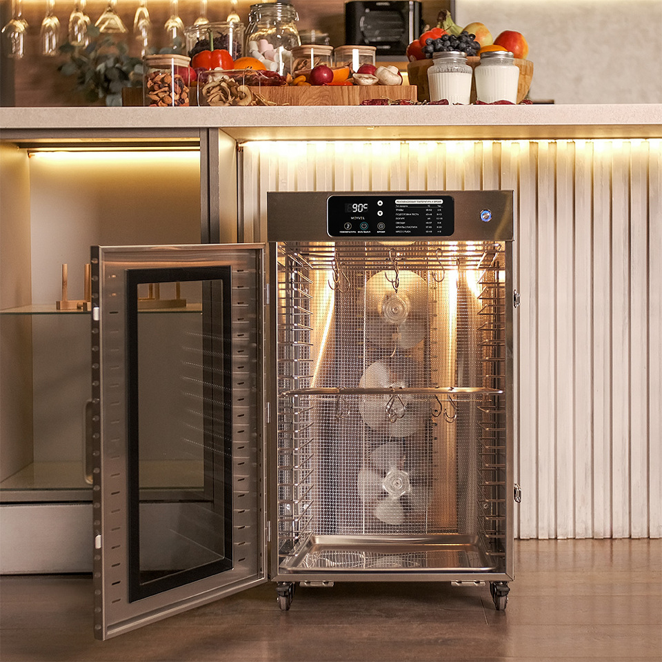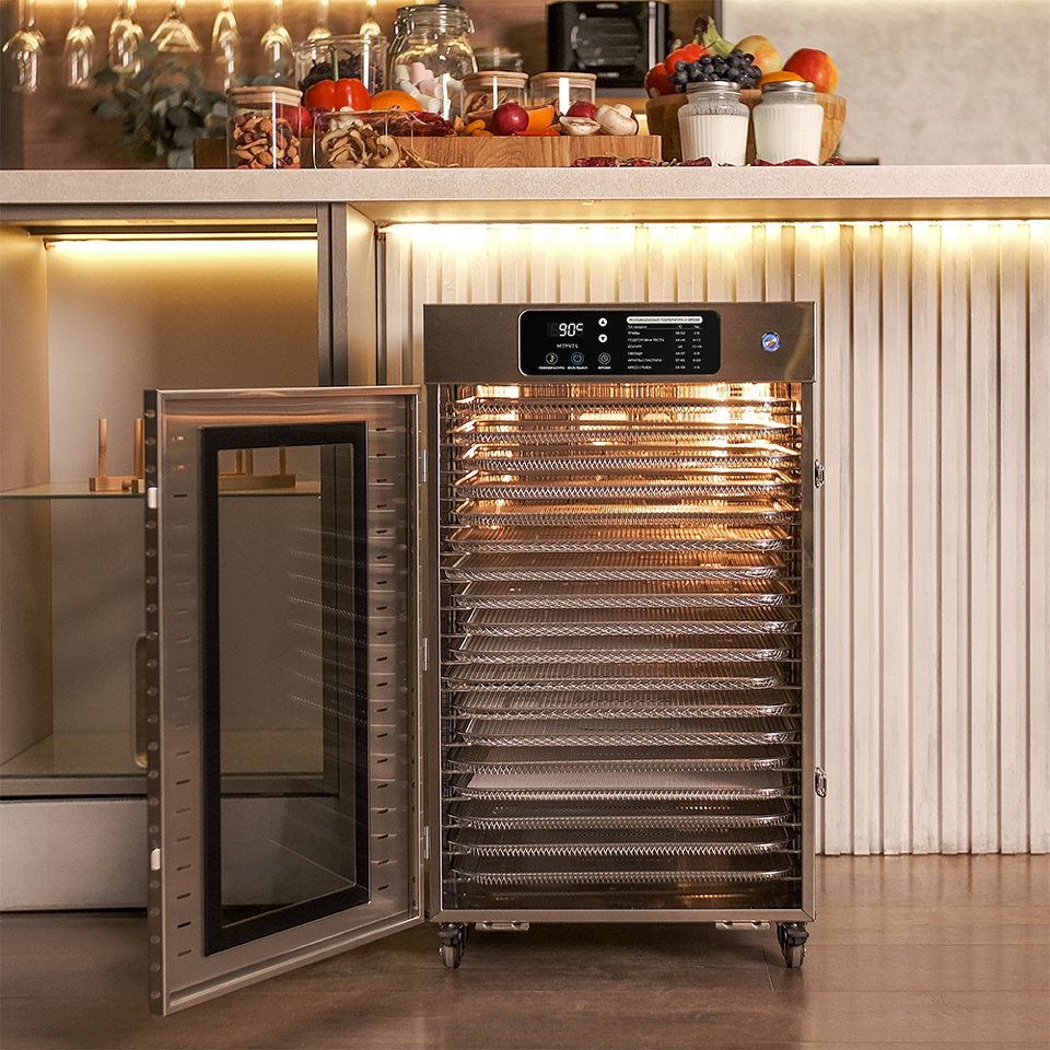 Корпус из прочной нержавеющей стали устойчив к высоким температурам и влаге, поэтому дегидратор долговечен и прост в уходе. Внутренняя камера оборудована 18 уровнями, между которыми выдержано оптимальное расстояние 30 мм для равномерной циркуляции воздуха.