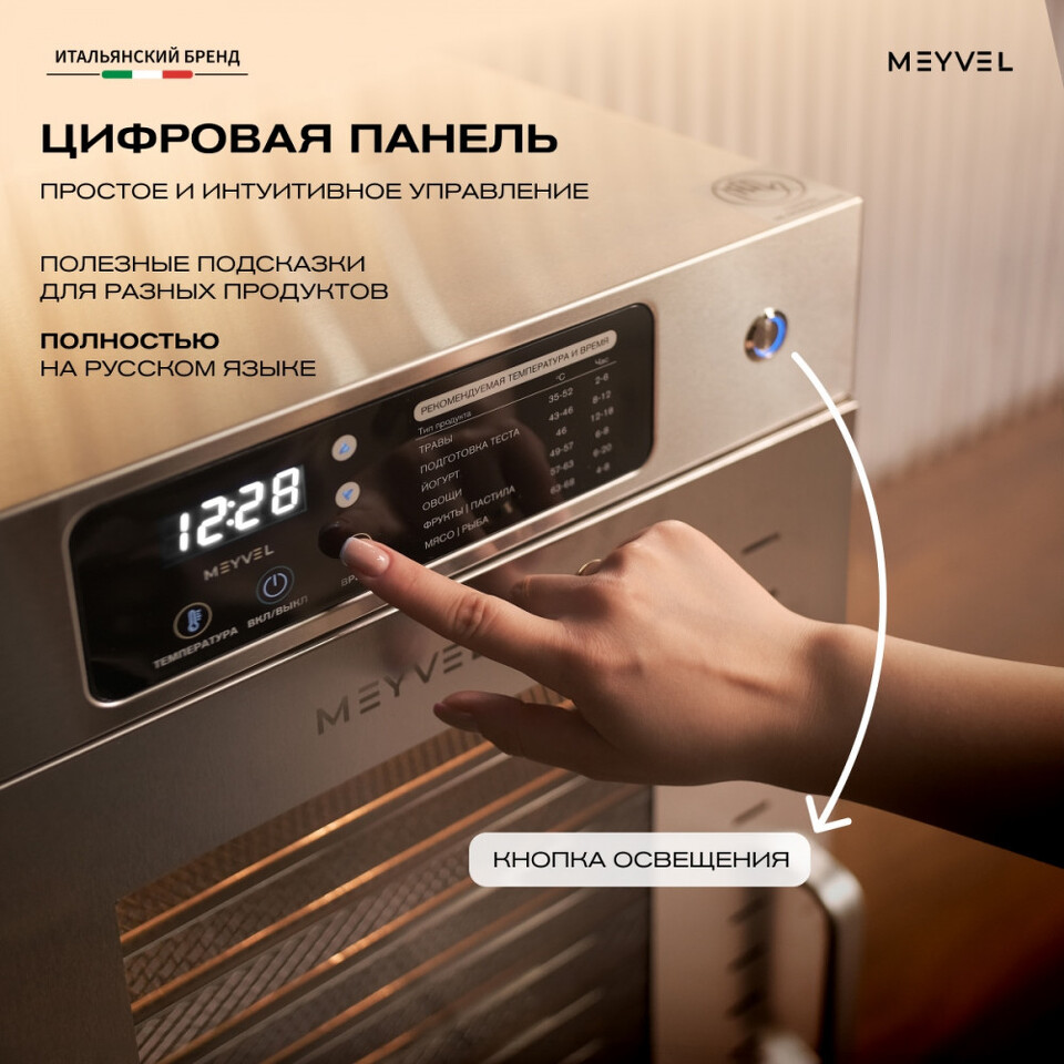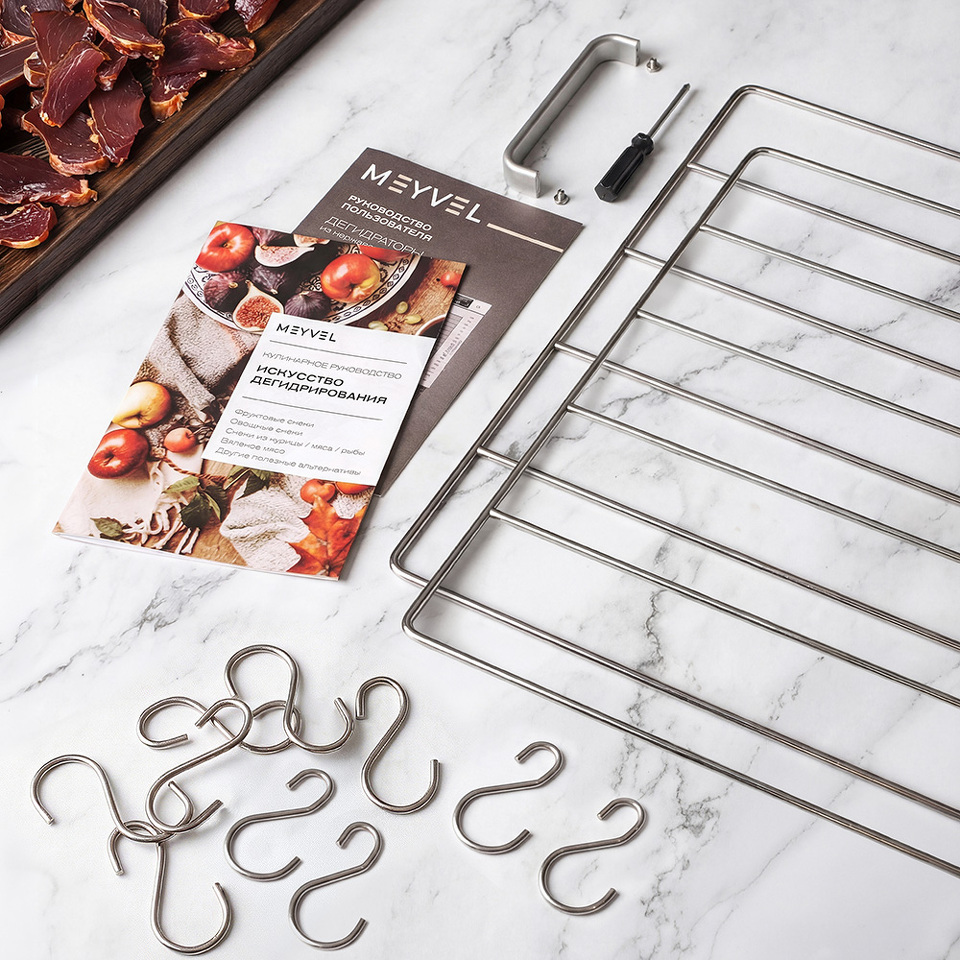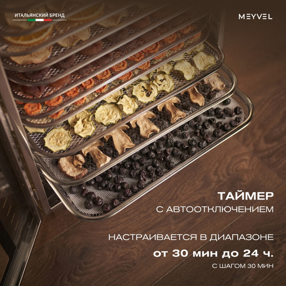 Такое оснащение превращает Meyvel MDH18-1S (Нержавеющая Сталь) (Inox) в универсальный инструмент: он одинаково хорошо справляется и с сушкой зелени, и с приготовлением деликатесов.