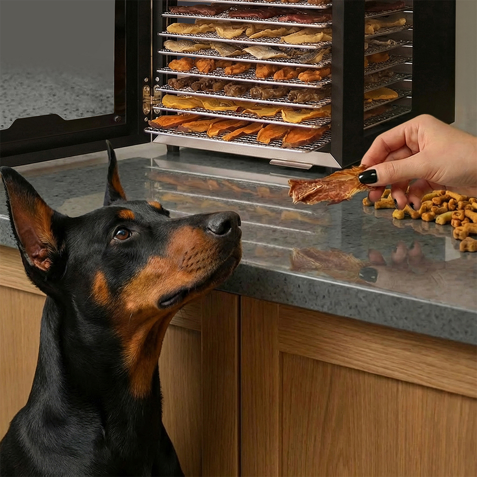 Чёрный корпус из нержавеющей стали, устойчивый к нагреву, влаге и коррозии, выглядит лаконично и современно, легко вписывается в интерьер кухни или мастерской. Внутри установлено 20 поддонов из нержавеющей стали с зазором 25 мм — этого достаточно, чтобы удобно размещать ломтики фруктов, травы или мясные полоски. В комплект также входят: