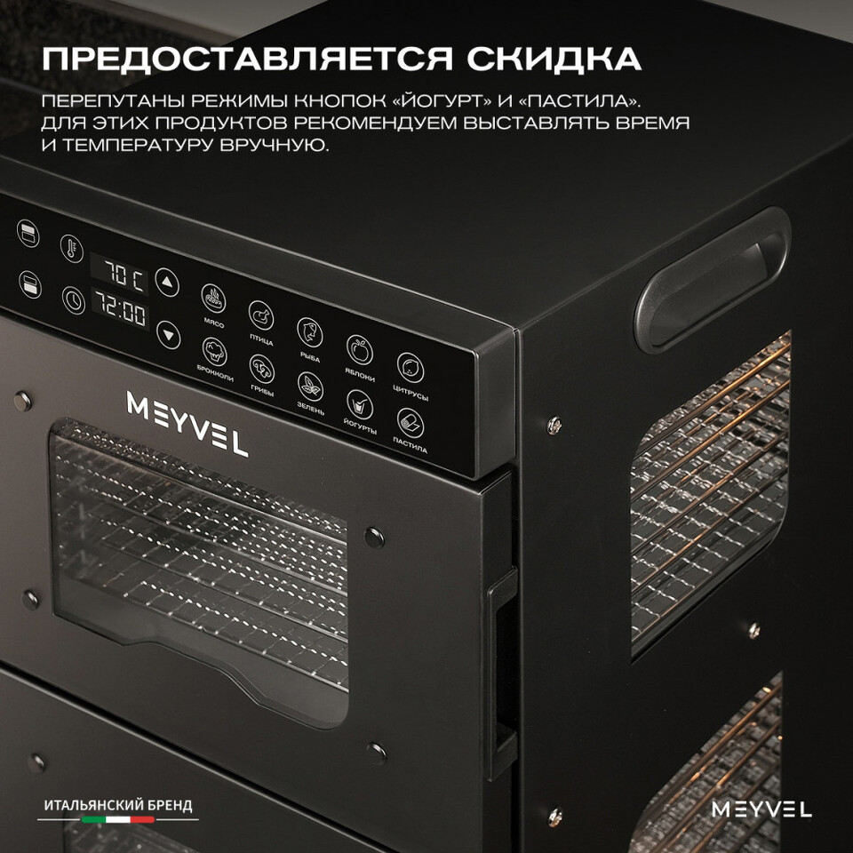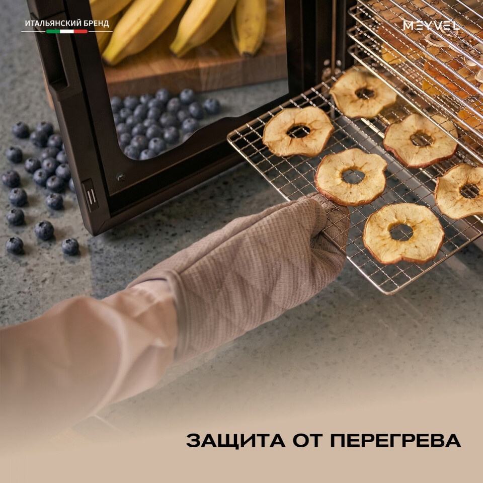 Meyvel MDH20-1S2 (Чёрный) (Black) — это современный дегидратор, который создан для тех, кто хочет заготавливать фрукты, овощи, мясо, травы и ягоды без потери их вкуса и пользы круглый год. Прочный корпус, продуманная конструкция и умная электроника превращают его в надёжного помощника на каждый сезон.