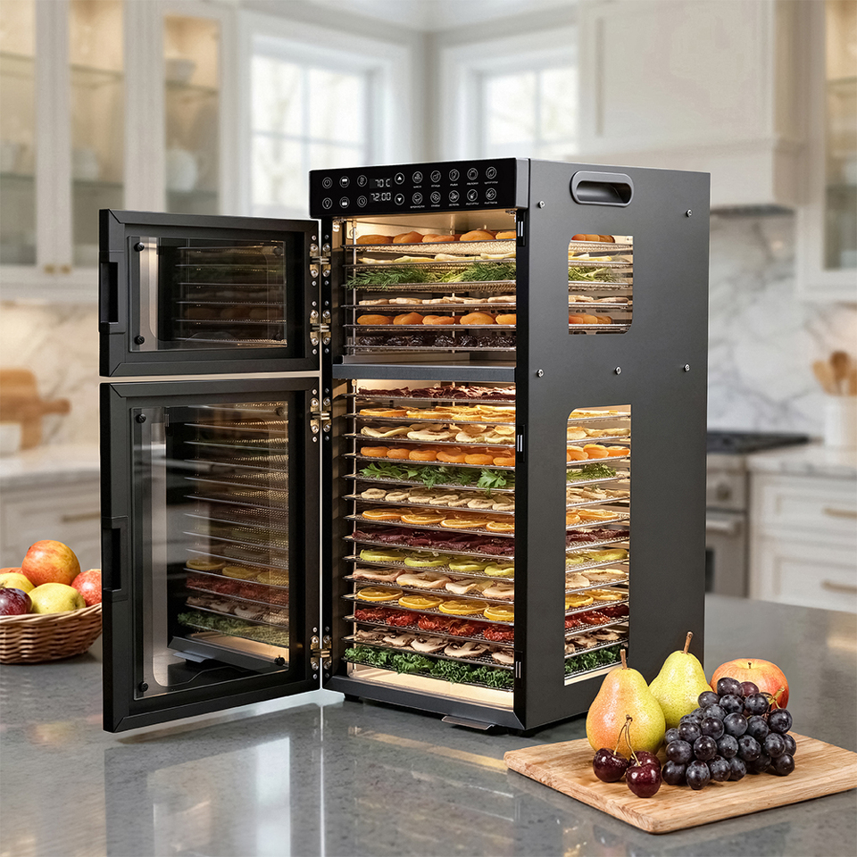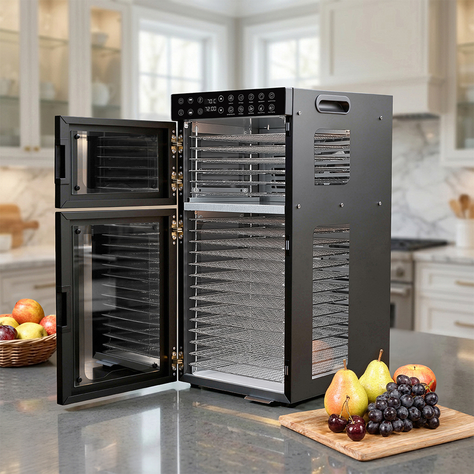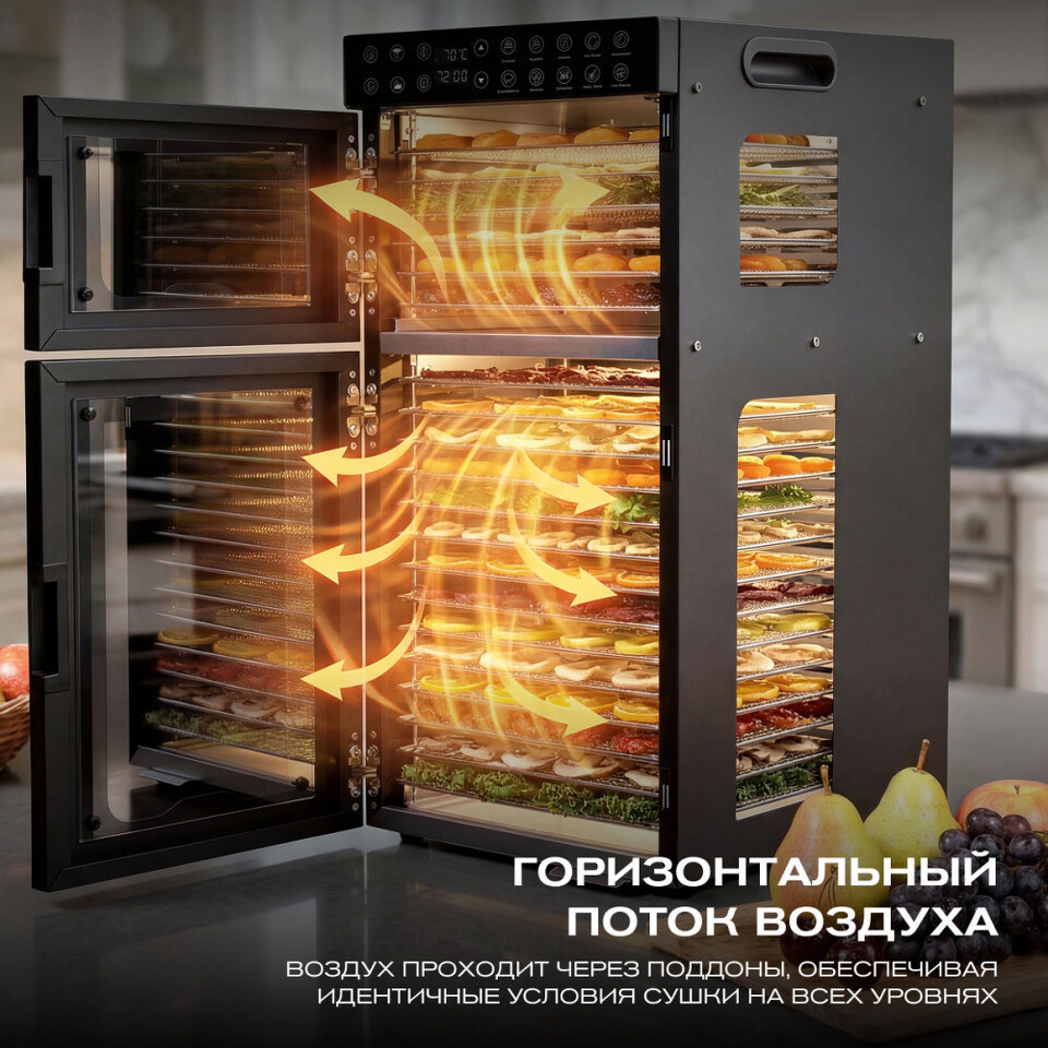 Этот дегидратор оснащён двумя отдельными зонами сушки, в каждой из которых можно установить отдельный режим. Вы можете одновременно готовить разные продукты, задавая для каждой камеры свои параметры температуры и времени. Это удобно, когда, например, фрукты требуют деликатной обработки, а мясо или овощи более интенсивной.