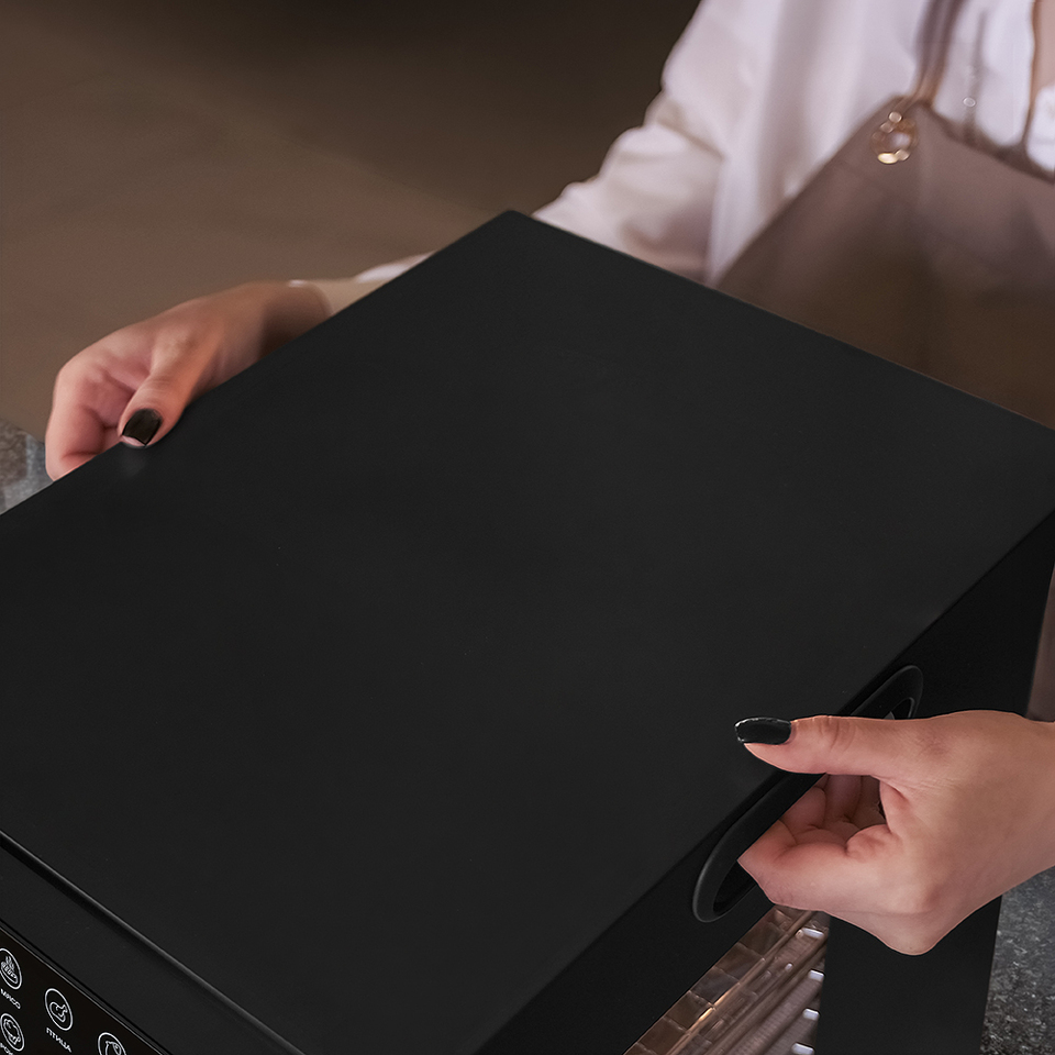 Дверца с жаростойким стеклом держится на магнитных защёлках — удобно открывается и плотно прилегает, сохраняя тепло и равномерный поток воздуха. Для удобства переноски по бокам предусмотрены ручки. На корпусе и крышке есть смотровые окошки, чтобы наблюдать, как сушатся продукты.